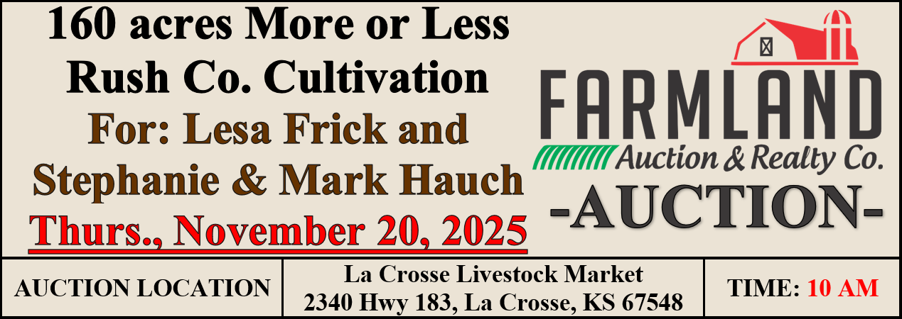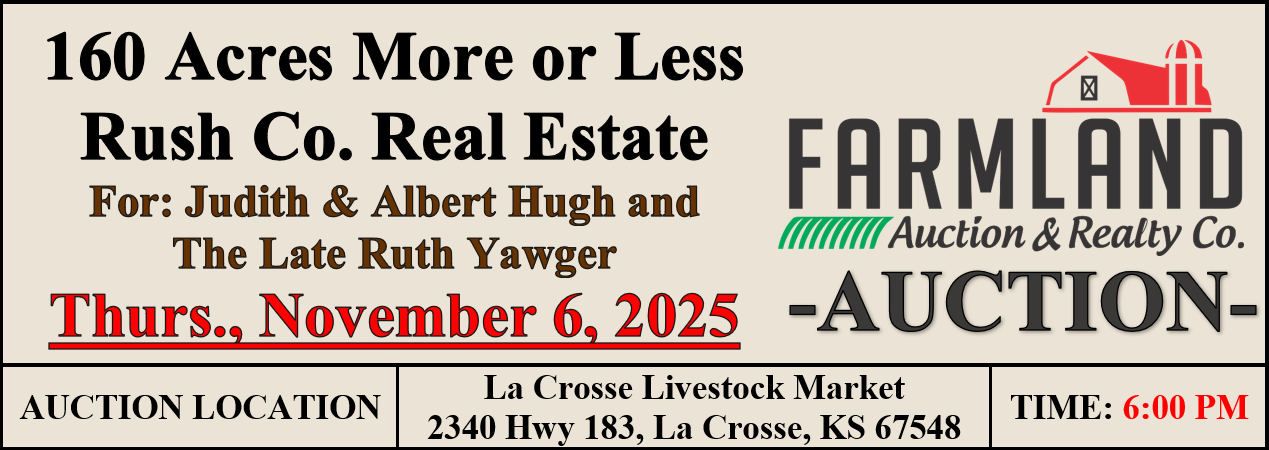 AUCTION: 160 Acres +/- Rush Co. Real Estate Auction Start Time : 6:00 PM For: Judith & Albert Hugh and The Late Ruth Yawger Thurs., November 6, 2025 Auction Location: La Crosse Livestock Market, 2340 Hwy 183, La Crosse, KS 67548 LAND LOCATION: From Intersection of Hwy K4 & Hwy 183 in LaCrosse, KS, go 4 miles West to CR 210, then South 1 mile to the NW Corner. LEGAL DESCRIPTION: The Northwest Quarter (NW/4) of Section One (1) Township Eighteen (18) South, Range Nineteen (19) West of the 6th PM, Rush Co., KS F.S.A. INFORMATION: 152.00 Acres Cultivation 3.15 Acres Waterway GENERAL INFORMATION: This is a very nice tract of cultivation being 79% Harney silt loam with 0-3% slopes and 21% Uly silt loam with 1-3% slopes. Access is good via well maintained county roads CR 210 on the West and M Avenue on the North. This property is in close proximity of two competitive grain elevators at Rush Center and LaCrosse. TAXES: Sellers to pay all of the 2025 and prior years taxes. The Purchaser to pay the 2026 and future taxes. 2024 Taxes were $1,285.08. MINERALS: To Sellers knowledge all minerals are intact and will convey with the surface GOVERNMENT PROGRAMS: Purchaser to stay in compliance with all US Government Programs the property is presently enrolled in. Government payments to follow current F.S.A. guidelines. This tract is enrolled in the PLC program. POSSESSION: Possession on approximately 49 acres planted to milo will be after 2025 milo harvest or December 30, 2025, whichever is later with Sellers retaining their 1/3 share of the harvested milo. Possession on approximately 103 acres planted to wheat will be after 2026 wheat harvest or August 1, 2026, whichever comes first with Purchasers 1/3 share of the harvested wheat delivered to the elevator in Purchasers name. Purchasers will be responsible for paying their 1/3 share of any future cost related to the growing crop including top dressing in the spring, Federal Crop Ins. Prem., and a fungicide application, if needed. TERMS: 10% down day of sale, balance to be paid upon title approval and delivery of deed, said closing to be on or before December 19, 2025, or as soon as title requirement, if any can be corrected. Every effort will be made to honor said original closing date set forth in this contract. Sale is not contingent on the purchaser obtaining financing. Financing, if necessary, needs to be approved prior to the auction. The seller agrees to convey said property by good and sufficient Deed to the purchaser, subject to easements, restrictions, roads, rights-of-way, leases, reservations, and county zoning regulations of record. Said deed shall be delivered to the purchaser at the time of settlement. Seller(s) to furnish and pay for title insurance showing merchantable title in the Seller. Title Insurance is being prepared by Security 1st Title, LaCrosse, KS. This Tract is being sold by U.S. Government Survey. If the purchaser feels that an additional survey is needed, the cost shall be the responsibility of the Purchaser. Listing Agent: Roger Legleiter 785-623-8717 Agency Disclosure: Farmland Auction & Realty Co., Inc is the agent of the seller. If purchaser desires representation, legal council is advised. Farmland Auction & Realty Co., Inc. Roger Legleiter, Licensed R/E Sales & Autioneer Jason Pfeifer, Broker & Autioneer Kalli Windholz, Licensed R/E Sales Brandon Pfeifer, Personal Property Salesperson/Auctioneer 1390 E. 8th Street, Unit A Hays, KS 67601 (785) 628-2851 Email: farmland @farmlandauction.com