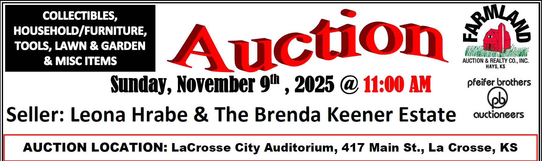Seller: Leona Hrabe & The Brenda Keener Estate Sunday, November 9th, 2025 @ 11:00 AM AUCTION LOCATION: LaCrosse City Auditorium, 417 Main St., La Crosse, KS Auction Company are agents of the sellers and are not responsible for accidents or theft. No guarantees or warranties will be expressed or implied. This is only a PARTIAL LISTING. More photos will be available on our website. www.farmlandauction.com Terms of sale: Cash, Checks, Debit/Credit Cards. Lunch Stand to be provided. Listing Agent: BRANDON PFEIFER, (785) 650-7588 TOOLS, LAWN & GARDEN: Mustang 3-wheel Riding Mower Ariens Mower Dewalt 18V Power Tools: Drill, Reciprocating Saw, Light, Skil Saw Rigid Screw Gun Wet/Tile Saw Shovels, Garden Hose, Ladders Wheelbarrow Wicker Patio set Floor Jack Pliers, Vise grips, Screw drivers Battery chargers Sockets, ratchets and breakover handles LED shop light Propane Bottle shop heater Shop Vice 200-amp battery charger Creeper Bench Grinder Rolling Toolbox Crows foot wrenches Large Upright air Compressor Engine Stand Air Bubble 4” grinder Air tools, chisels and impacts Torque wrenches Milk Heater Wobbler water sprinkler Small Pancake Air Compressor Tackle boxes and fishing supplies Hunting knife filet set FURNITURE & APPLIANCES: Oak Sofa Table & File Cabinet Oak Sitting bench Floor lamps Oak Pedestal table, 2 leaves China Cabinet Curio Cabinet Brown Modern Sofa like new Two matching end tables Chest style Deep Freezer HOUSEHOLD & MISC.: Over 800+ salt and pepper shakers containing Betty Boop, Coke, pigs, fish, dogs, pilgrims Bears, Texaco, cows, John Deere, Turkeys, Trains, Green Bay NFL, Shawnee, Chickens, Pheasants, Horses Community silverware set (12) Shoe Storage Cubical Silver plated silverware Toaster, Blender, Mixer Bedding and Quilts Slo-cooker Metal storage cabinet Card table and chairs Step stool Cookbooks Golden Liteway scooter 32”TV Antiques and Collectibles Carnival glass bowl Crout cutter Buffett China Hutch Herford Bull Coors Light piggy banks Costume Jewelry, turquoise Steel wheel Metal Junk art planter Coors Beer Tap 1971 KS License plate Blue Jars Old Fashioned Movie Popcorn Popper Lots of The Duke John Wayne Collectibles Clocks, Lunch Boxes, plates, Wall pictures Farmland Auction & Realty Co., Inc. 1390 E. 8th, Unit A Hays, KS 67601 785-628-2851 E-mail: farmland@farmlandauction.com Web: www.farmlandauction.com