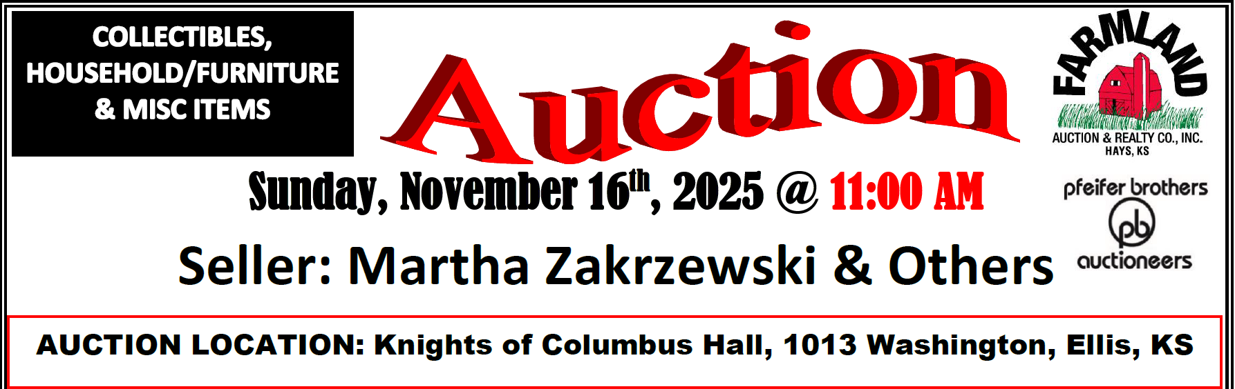 Seller: Martha Zakrzewski & Others Sunday, November 16th, 2025 @ 11:00 AM AUCTION LOCATION: Knights of Columbus Hall, 1013 Washington, Ellis, KS Auction Company are agents of the sellers and are not responsible for accidents or theft. No guarantees or warranties will be expressed or implied. This is only a PARTIAL LISTING. More photos will be available on our website. www.farmlandauction.com Terms of sale: Cash, Checks, Debit/Credit Cards. Lunch Stand to be provided. Listing Agent: BRANDON PFEIFER, (785) 650-7588 COLLECTIBLES: Yamaha Guitar Metal cooler Amcrest Pacific Silver-plated Silverware Crock Jugs Coop, Mobile Fuel Cans Blue Ribbon Crock Bottle Capper Metal Bread Boxes Wood Clamps China Chandelier Crystals Horse Hames Lighting Rod with Ceramic Ball Porcelain Tubs P & G Soap Box Blow Torch Cast Iron Skillets and griddles Hand Braces Jack Daniels Racing Hood LK Dairy Milk Crate Ice Cream Parlor Stool Shovels and Rakes Fishing Poles Metal Egg Baskets Flexible Flyer Snow Sled Galvanized Tubs and Buckets Old Metal Toys Large Blue Glass Jug Large Brass Fish Stain Glass light Wooden Hand Cart Toy Trucks and tractors/Tonka Cast Iron Claw tub feet Wooden Spring Horse Gerri Can Kerosene Stove 12-volt Cattle Moormanns Feeds Fly Duster Meat Saws Sara Plain and Tall Ornaments Phillips 66 oil cans Windmill Blades HOUSEHOLD/FURNITURE: Full size Sofa Two high back sitting chairs End tables and coffee tables Buffet side table 24” flat screen TV Oak Pedestal table and chairs with one leaf 3 oak bar stools Lift/Recliner chair Sterio CD player Recliner Sofa table Solid Oak Buffet Rod Iron Queen size bed Bed side foot bench Modern Cherry Bedroom Dresser and Chest of Drawers Nightstand Wicker Trunk Wooden Rocker Single Bed Smaller Chest of drawers Office chair Multiple Bookshelves Lazy Boy love seat and double recliner and matching recliner 2 wicker storage baskets Corner stand Red drop leaf table and chairs Red Bookshelf Floor fans Wooden Toy Bench Brother sewing Machine and table Luggage Folding table and chairs Smaller wooden Childs chair LAWN & GARDEN & TOOLS: Rod Iron Patio table and Chairs Iron patio bench Garden Hose and reel Farmland Auction & Realty Co., Inc. 1390 E. 8th, Unit A Hays, KS 67601 785-628-2851 E-mail: farmland@farmlandauction.com Web: www.farmlandauction.com