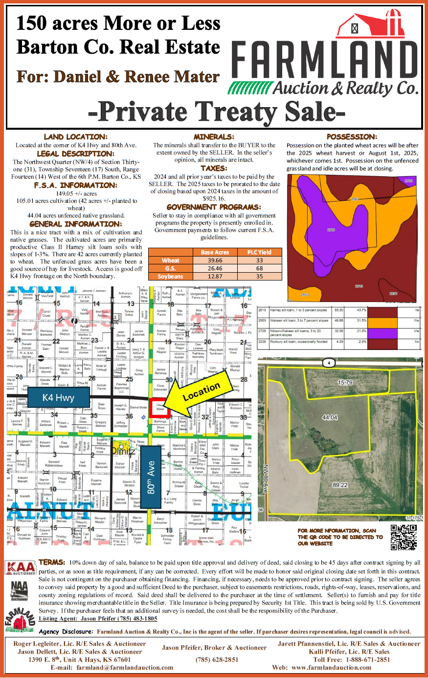 Agency Disclosure: Farmland Auction & Realty Co., Inc is the agent of the seller. If purchaser desires representation, legal council is advised.