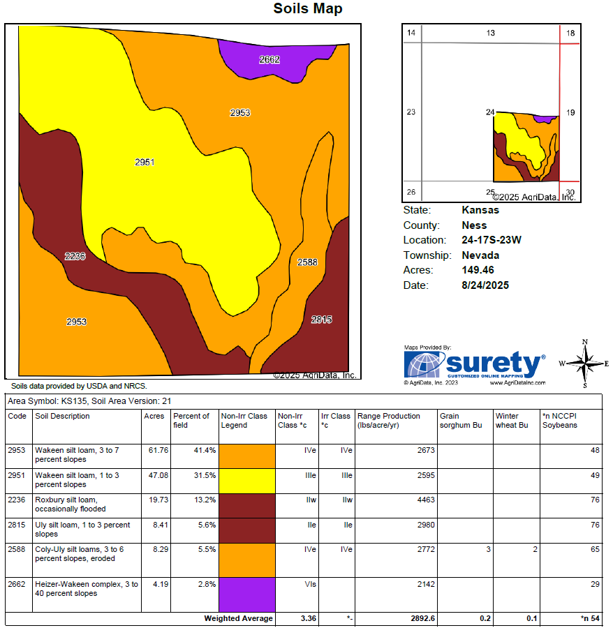 PRIVATE TREATY: 230 Acres +/- Rush Co. Real Estate Listing Price: $680,000 LAND LOCATION: The North Tract is conveniently located at the corner of KS Hwy 96 and CR 180. The South Tract is ½ mile South on CR180, with the farmstead being ¼ mile East on Ave Q. LEGAL DESCRIPTION: A Tract in the West Half of the Southwest Quarter (W/2 SW/4) of Section Twenty-one (21), Township Eighteen (18) South, Range Nineteen (19) West of the 6th P.M. Rush County, Beginning 290’ N & 30’ E of the Southwest Corner of the Southwest Quarter, then North 1,600’, East 150’, North 200’ West 150’, North 380’, Northeasterly 892’, East 996’, South 2,630’, West 1,236’, North 290’, West 50’ to POB AND The Northwest Quarter (NW4) of Section Twenty-Eight (28), Township Eighteen (18) South, Range Nineteen (19) West of the 6th P.M. Rush Co., KS COMMON ADDRESS: 1824 Ave Q, Nekoma, KS F.S.A. INFORMATION: 165.83 +/- acres cultivation (40.46 acres planted to wheat) 45 +/- acres Irrigated cultivation with Reinke 7-stand Irrigation Pivot New in 2024 120.83 acres Dryland cultivation 40.98 acres fenced grassland & trees 18.26 acres Expired CRP 3 acres farmstead with dwelling and improvements GENERAL INFORMATION: This is a nice tract with a mix of cultivation and native grasses. The cultivated acres are primarily productive Class II Harney silt loam soils with slopes of 1-3%. There are 40.46 acres currently planted to wheat. The fenced grass acres have been a good source of hay for livestock. Access is good off K-96 Hwy frontage on the North boundary. This tract includes a one-story bungalow-style residence constructed in 1927, offering approximately 1,260 square feet of main-floor living space with four bedrooms and one full bathroom. The home features a full basement, cement fiber siding, 10-15 yr old composition shingle roof, and forced central air. Exterior amenities include an enclosed wood deck and a raised slab porch with roof. Breaker boxes have extensive updates. Additional improvements consist of a detached residential garage and multiple utility and tool sheds that provide practical storage and functional space. MINERALS: The minerals shall transfer to the BUYER to the extent owned by the SELLER. In the seller’s opinion, all minerals are intact. TAXES: 2025 and all prior year’s taxes to be paid by the SELLER. The 2025 taxes combined were $2,291.82. The 2026 taxes will be determined at the time of contract signing. POSSESSION: Possession on the 40.46 acres planted wheat will be after the 2026 wheat harvest or August 1st, 2026, whichever comes 1st with the landowners’ 40% share delivered to an elevator in the landowners’ name. Landowner/purchaser will be responsible for their 40% share of any additional costs related to the growing wheat crop including their 40% share of Federal Crop Insurance premiums. Possession on the idle milo stalks, corn stalks, fenced grass, expired CRP and wheat stubble to be negotiated at contract signing based upon tenant’s rights. TERMS: 10% down day of sale, balance to be paid upon title approval and delivery of deed, said closing to be 45 days after contract signing by all parties, or as soon as title requirement, if any can be corrected. Every effort will be made to honor said original closing date set forth in this contract. Sale is not contingent on the purchaser obtaining financing. Financing, if necessary, needs to be approved prior to contract signing. The seller agrees to convey said property by a good and sufficient Deed to the purchaser, subject to easements restrictions, roads, rights-of-way, leases, reservations, and county zoning regulations of record. Said deed shall be delivered to the purchaser at the time of settlement. Seller(s) to furnish and pay for title insurance showing merchantable title in the Seller. Title Insurance is being prepared by Security 1st Title, La Crosse, KS. This tract is being sold by U.S. Government Survey and Metes & Bounds Survey. If the purchaser feels that an additional survey is needed, the cost shall be the responsibility of the Purchaser. Listing Agent: Jason Pfeifer (785) 483-1805 Agency Disclosure: Farmland Auction & Realty Co., Inc is the agent of the seller. If purchaser desires representation, legal council is advised. Farmland Auction & Realty Co., Inc. 1390 E. 8th, Unit A Hays, KS 67601 785-628-2851 E-mail: farmland@farmlandauction.com Web: www.farmlandauction.com