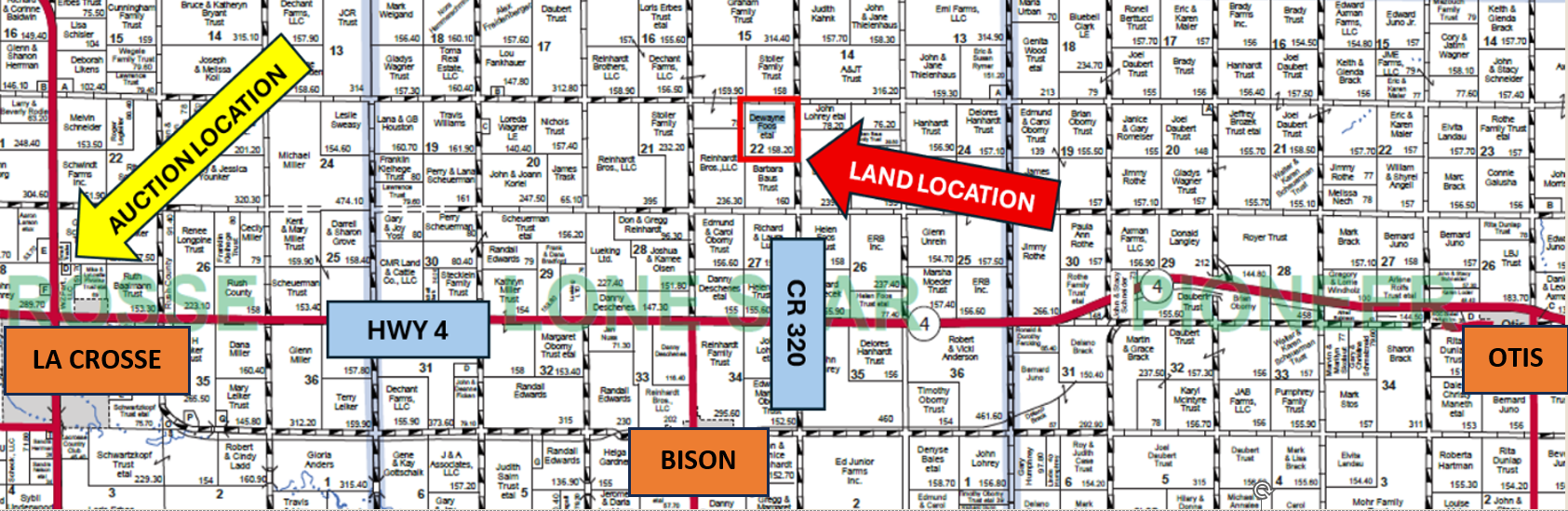 TERMS:  10% down day of sale, balance to be paid upon title approval and delivery of deed, said closing to be on or before October 6, 2025, or as soon as title requirement, if any can be corrected. Every effort will be made to honor said original closing date set forth in this contract. Sale is not contingent on the purchaser obtaining financing. Financing, if necessary, needs to be approved prior to the auction. The seller agrees to convey said property by good and sufficient Deeds to the purchaser, subject to easements restrictions, roads, rights-of-way, leases, reservations, and county zoning regulations of record. Said deed shall be delivered to the purchaser at the time of settlement. Seller(s) to furnish and pay for title insurance showing merchantable title in the Seller. Title Insurance is being prepared by Security First Title, LaCrosse, KS. This tract is being sold by U.S. Government Survey. If the purchaser feels that an additional survey is needed, the cost shall be the responsibility of the Purchaser.