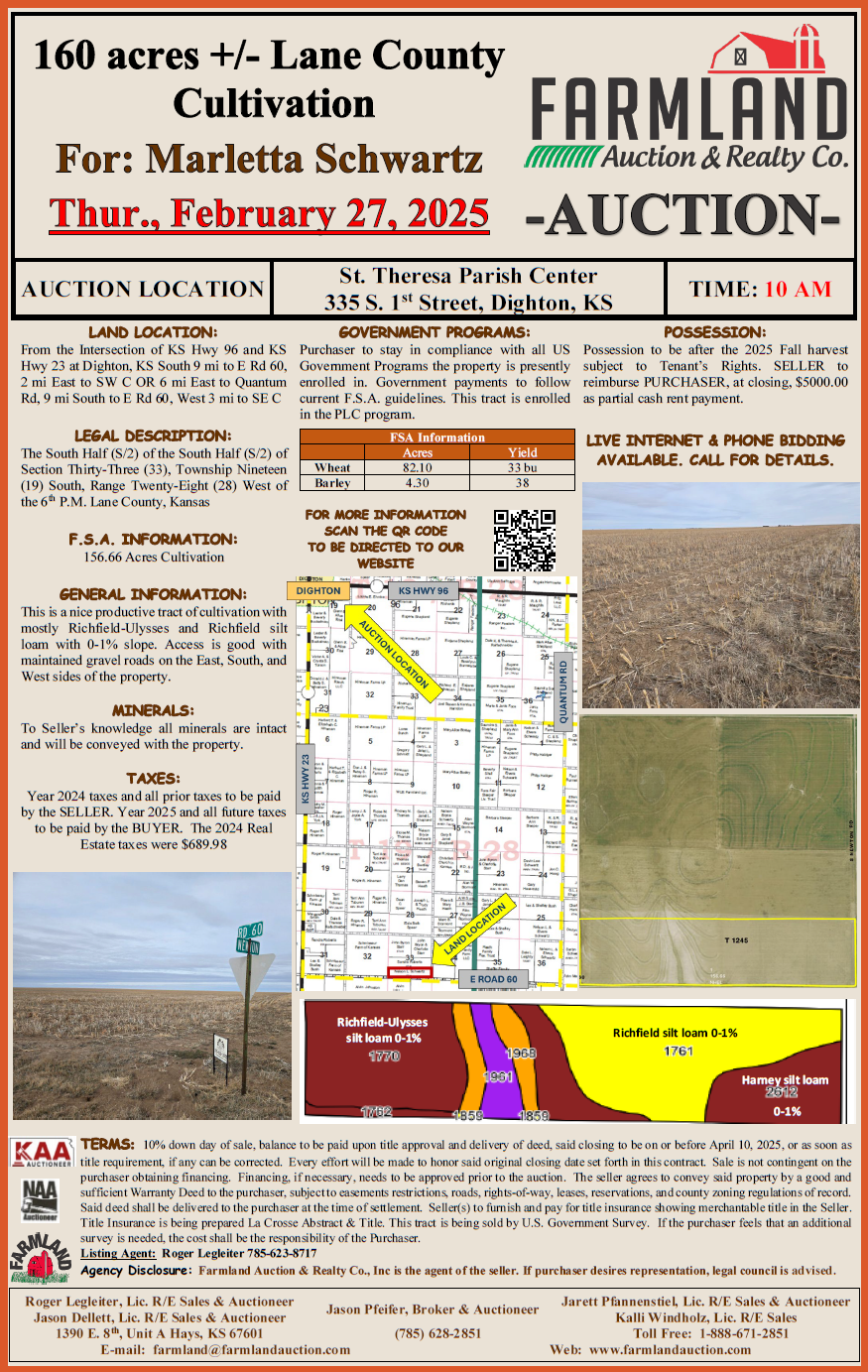 SOLD: TRACT 1: $385,000 TRACT 2: $600,000 515 acres +/- Rush & Pawnee Co. Real Estate For: Richard T. Frick Tuesday, October 14, 2025 TIME: 10 AM AUCTION LOCATION: Rush Center Township Hall, 220 Union St, Rush Center, KS 67575 LAND LOCATION: Tract 1: From Hwy 183 & X Rd in Pawnee Co., go 10.3 mi. W to SEC of property. OR: From Burdett at intersection of Hwy 156 & 345th ave. N 1 mi. to O Rd. then ½ mi. W to 350th ave. Then go 4 mi. N to T Rd. At T Rd go E ½ mi. to 340th Rd and then N 4 mi. to X Rd. At X Rd E for ½ mi. to the SWC of the property. Tract 2: From Rush Center go 6 mi. W to CR 190 then S 3.5 mi. to NWC of property. TRACT 1 LEGAL DESCRIPTION: The West Half of the East Half (W/2 E/2) of Section Eleven (11), Township Twenty (20) South, Range Twenty (20) West of the 6th P.M. Pawnee Co., KS TRACT 1 F.S.A. INFORMATION: 195.28 Total Acres 187.90 Acres Cultivation (to be planted to wheat) 7.38 Acres CRP at $59.21/acre through 9/30/2031 TRACT 2 LEGAL DESCRIPTION: The West Half (W/2) of Section Ten (10), Township Nineteen (19) South, Range Nineteen (19) West of the 6th P.M. Rush Co., KS. TRACT 2 F.S.A. INFORMATION: 316.61 Total Acres 305.92 Acres Cultivation (wheat stubble) 10.69 Acres Waterways GENERAL INFORMATION: Both tracts have been well maintained with excellent stewardship including conservation practices and fertility. Tract 1: Highly productive soils with 85% being class II with 0 to 3 percent slope, located in northern Pawnee County. Good access via county roads on the north and south side. Tract 2: This tract provides good productive cultivated acres with class II soils and 85% being Harney Silt Loam. Possession at closing creates an immediate income opportunity. MINERALS: All sellers minerals to be conveyed. To seller’s knowledge, all minerals are intact. TAXES: Sellers to pay all of the 2025 and prior years taxes. The Purchaser to pay the 2026 and future taxes. The taxes for 2024 were Tract 1: $1,218.12; Tract 2: $2,395.16. GOVERNMENT PROGRAMS: Purchaser to stay in compliance with all US Government Programs the property is presently enrolled in. Government payments to follow current F.S.A. guidelines. These tracts are enrolled in the PLC program. POSSESSION: Tract 1, Pawnee County: Possession on 187.9 acres planted to wheat to be after the 2026 wheat harvest or August 1, 2026, whichever comes first. PURCHASER to receive the landowner’s 1/3 share of the wheat crop harvested and delivered to an elevator in the landowner’s name. PURCHASER to be responsible for their 1/3 share of fertilizer and fungicide applied in the spring if necessary as well as crop insurance premiums for their 1/3 share. Possession on 7.38 acres CRP to be at closing with PURCHASER to receive 100% of the 2026 and future payments. Tract 2, Rush County: Possession immediate upon closing with the PURCHASER reimbursing SELLER for the chemical and application used for weed control applied to the property. TERMS: 10% down day of sale, balance to be paid upon title approval and delivery of deed, said closing to be on or before December 1, 2025, or as soon as title requirement, if any can be corrected. Every effort will be made to honor said original closing date set forth in this contract. Sale is not contingent on the purchaser obtaining financing. Financing, if necessary, needs to be approved prior to the auction. The seller agrees to convey said property by good and sufficient Deed to the purchaser, subject to easements restrictions, roads, rights-of-way, leases, reservations, and county zoning regulations of record. Said deed shall be delivered to the purchaser at the time of settlement. Seller(s) to furnish and pay for title insurance showing merchantable title in the Seller. Title Insurance is being prepared by Security First Title, La Crosse, KS. These tracts are being sold by U.S. Government Survey. If the purchaser feels that an additional survey is needed, the cost shall be the responsibility of the Purchaser. Listing Agent: Roger Legleiter (785) 623-8717 LIVE INTERNET & PHONE BIDDING AVAILABLE. CALL FOR DETAILS. Agency Disclosure: Farmland Auction & Realty Co., Inc is the agent of the seller. If purchaser desires representation, legal council is advised. Farmland Auction & Realty Co., Inc. 1390 E. 8th, Unit A Hays, KS 67601 785-628-2851 E-mail: farmland@farmlandauction.com Web: www.farmlandauction.com