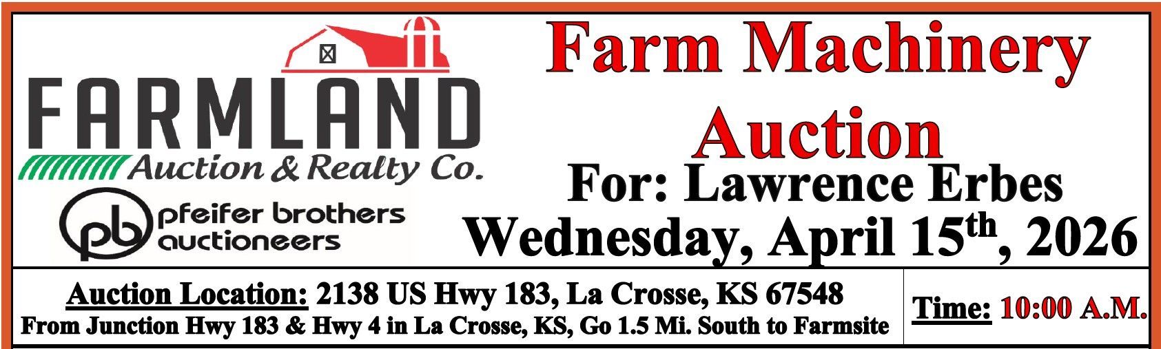 Auction Company are agents of the sellers and are not responsible fW RGor accidents or theft. No guarantees or warranties will be expressed or implied. This is only a PARTIAL LISTING. More photos will be available on our website www.farmlandauction.com OR www.pfeiferbrothersauction.com