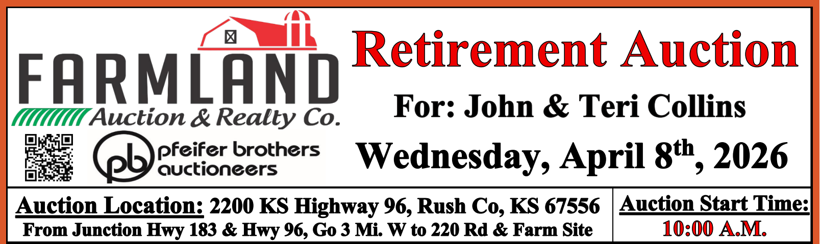 Seller: John & Teri Collins Wednesday, April 8th, 2026 @ 10:00 AM Auction Location: 2200 KS Highway 96, Rush Co, KS 67556 From Junction Hwy 183 & Hwy 96, Go 3 Mi. W to 220 Rd & Farm Site Auction Company are agents of the sellers and are not responsible for accidents or theft. No guarantees or warranties will be expressed or implied. This is only a PARTIAL LISTING. More photos will be available on our website. www.farmlandauction.com Terms of sale: Cash, Checks, Debit/Credit Cards. A lunch stand will be on site. Auctioneers Note: John has been in the farming & livestock business along with his father, brother, and family his entire life. You can tell by the condition of his items that his heart was deep into his occupation. John has decided to retire and offer to the public his pride & joy. LARGER ITEMS TO SELL @ 12:00 Listing Agent: Roger Legleiter (785) 623-8717 COMBINE & HEADERS 2006 JD 9760STS w/bullet rotor, 9-Liter engine, 4005 E hrs., & 2808 S hrs., Star Fire GPS, 800-70R-38 Drive Tires & 28L-26 rear tires SN# H097605715596 JD 680 1293 12-row corn header, 30" rows, single point, SE# H01293X696131 4-wheel E-Z trail header trailer JD 930 draper header, (good condition) A & L grain cart, F-505 corner auger, older roll-over tarp (2) Speed King pto augers, 71 'x8" and 45'x8" PLANTING & TILLAGE: JD 1890-C air drill, 30' w/10" spacings, purchased new in 2014 w/Model 1910-T 270 seed box 120+150 bu., 28Lx6 tires, Seed Box SE# 1A81910TTDW755245, Planter SE# 1A890CADH755194 Case IH 1230 12-row planter, 30" rows, vertical fold, SE# Y95007423 Kent 36' series V field cultivator, w/harrows, Mod 6330-98 SE 15561 Crust Buster grass drill 14ft 18 row, 10" spacings, 3 pt., w/additional adapter for grain setting SE# DR-6245 Sunflower Mod 1433, 35' C-flex disc, front 22", back 24" SE# 0433F19990034 (Good condition) Sunflower Mod 80TA-27' double off-set disc 20" front, 21" back, SE# 1810 Kent 7X4's laser plow w/pickers, Mod 9326 SE# 13766 Leon-1000, 10 yd. dirt scraper, good cond. SE# 8180605 Flail shredder, 18', 3-point, SE# 14968 Case 6x20 plow, 2-point Flex-King 3x6's w/pickers, needs tires Malsam Terracer, hyd., single belt, Model HS89 SE#566-L Big Ox 3pt. 7 shank ripper on 20" centers 3 pt. Bemis land plane w/ 12’ blade, 28’ field cultivator 13.5' older batwing mower w/new pto shaft (working) NH3 applicator, 27', pull type, 20" spacings Convey-All Tender Box, 2 Compartments, hyd. drive HAY, LIVESTOCK, MISC: Knight 3030 Reel Auggie mixer, pto., In Good Condition, Digi Star Scales, SE# 0431 NH BR 780 round baler, small 1000 pto, net wrap or twine, new belts recently, SE# 67946 JD 3830 Swather, hydrostat w/4-cylinder diesel, shows 4645 hrs., 16' header, 300-A twin knife SE# EO3830X810053 An additional 16' JD header w/n ew auger, parts, SE# F00300X807456 1996 Titan GN livestock trailer, torsion bar axles, w/ 16" tires, 20'x6.5', SE# 4TGG20205Tl 004082 1992 Trailmann GN livestock trailer 20'x6.5', 16" tires, divider gate, SE# IM9LA2023N1328356 1000 gal. Nurse tank, good, on tandem axle trailer w/Predator engine 1000 gal. Nurse tank, cracked, on tandem axle trailer w/Honda engine L & H 160 bu. Creep feeder w/panels, good cond. L & H double feed bunk and head stalls, new B & W round bale feeder Hasting 10’ polly, 4’ galvanized stock tanks (2) Hydra grabbers, for square bales Dudry wire roller, Dan-Huser post hole digger 9” & 12” My-D Han-D wire roller, w/gas motor and wire Additional lg. roll new wire and elec. fence posts GB grapple fork, homemade, w/telehandler attachment Bale spear w/telehandler attachment Hasting portable bulk tank, w/auger Otter dozer blade, 12' (no brackets) 18 pieces of red iron, 20' long (rough) 50 +/- joints 2 7 /8 structural tubing Support arms off of pivots for structural work 40' long pieces of pipe from pivot 100 +/- joints irrigation pipe, and salvage iron BOATS & ATV Starcraft Boat w/Mercury 100hp motor, thunderbolt ignition, on trailer Bass tracker john boat & trailer, Evinrude 3.3 Pelican Paddle Boat Polaris Sportsman 4-wheeler, 800 twin 4x4, 336 hours, 3,135 miles, VIN: 4XAMH76AX6A924927 Yamaha Tri Moto 3-Wheeler VIN: JY321V003FCI62671 TRACTORS, MOTOR GRADER, TRUCKS & TRAILERS: 1991 Ford 846-91 w/Cummins, bare back, w/ 18.4x38 duals ft & rear, 12 spd. transmission, 4 remotes, 5416 hrs., SE# D-475-30 International 1086, diesel 3 pt., pto, 18.4x38 rear, w/ new style air condition, runs good JD 840 Loader w/ 8000 series brackets, 8’ bucket, 2¼ Yd., Like New condition; SN: W00840X003186 JD 770-A Motor Grader w/ 531 engine, shows 4367 hrs., gear drive w/ hydraulic controls, 14' new cutting edge, SE#06916T 2001 IH 9400 Eagle Pro Star, w/ Detroit 60 series, 12.7, 450 H.P. 9 transmission, 22.5 Tires, Sleeper VIN# 2HSCNAMR31C070736 1994 White GMC, day cab, twin screw, Fuller 9-speed, Detroit 60 series engine, air brakes, seat, & suspension VIN#4VIJDBRF6RR831525 Fruehauf Flatbed semi-trailer, 42' w/ 4.5' ext. x7.5', 10:00Rx20 tandem duals (older), VIN: FWZ272652 1972 Titan Grain trailer, 38', steel chassis & floor w/aluminum sides, 2 hoppers, 1000 bu., 11Rx24.5 tandem duals 1985 Monon 27' Cargo trailer w/8'x9' overhead door, wood floor, single axle w/11Rx22.5 tires, VIN# 1NNVF2815FM096675 Tandem Axel Fuel Trailer, 500 gal. tank, 12 Volt pump Utility 8’x5’ Trailer w/ expanded metal floors & ramp Seed tender BT-240 w/hyd. belt conveyor, SE# 00899 500 gal. L.P. tank on older trailer Homemade trailer w/ dual tandems, to move 40’ calf sheds Homemade 5th wheel flatbed, 118” wide w/ tandems Farmland Auction & Realty Co., Inc. 1390 E. 8th, Unit A Hays, KS 67601 785-628-2851 E-mail: farmland@farmlandauction.com Web: www.farmlandauction.com