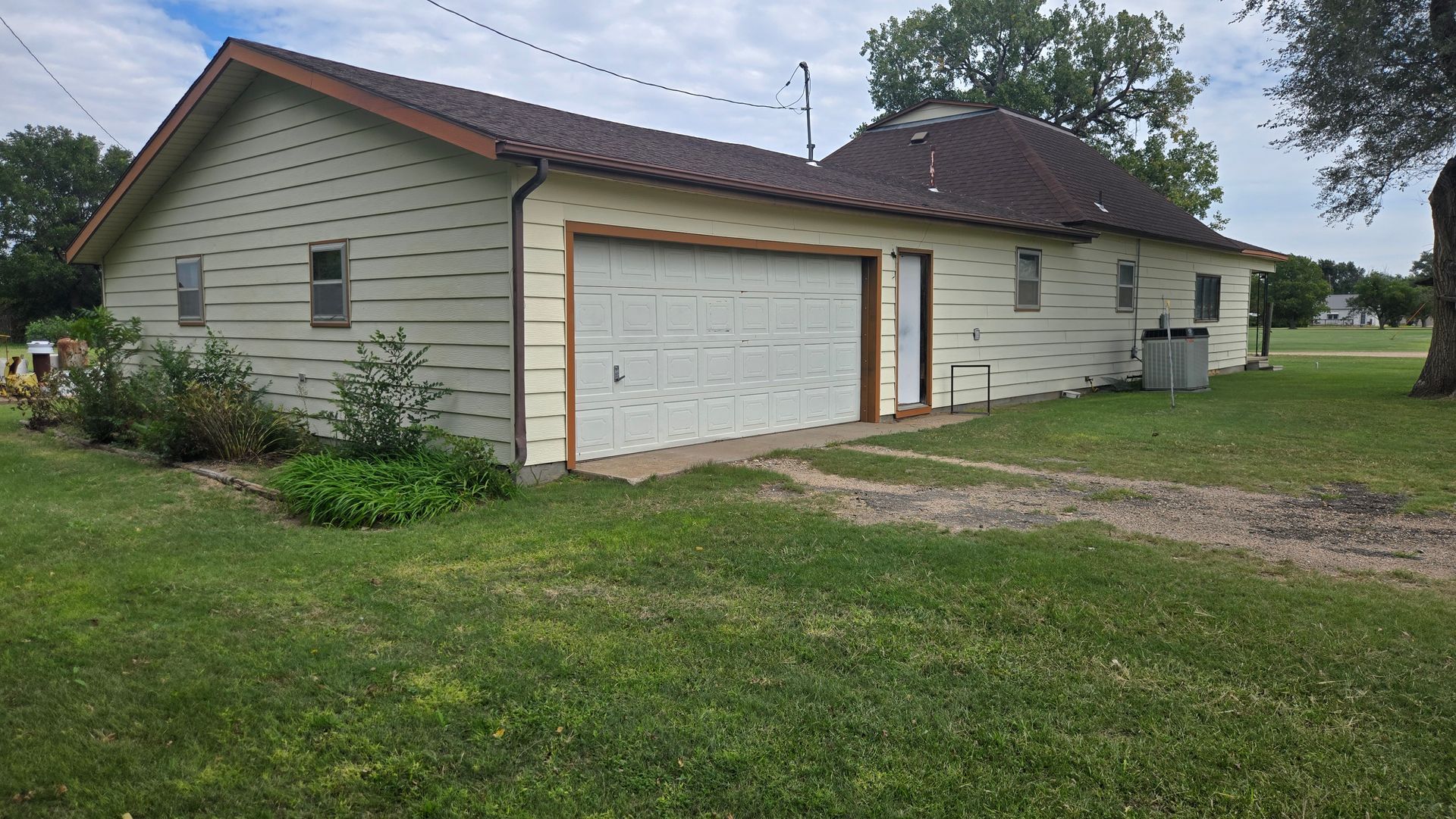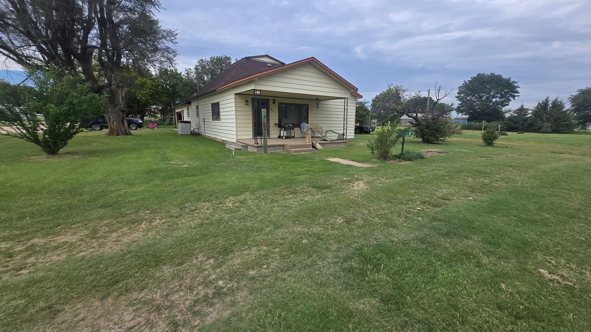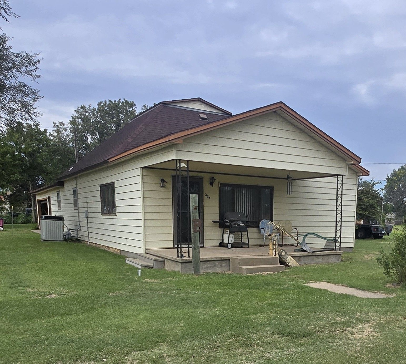 This is a nice home located on the corner of a large lot providing privacy as well as the potential to build. It is an older home that has been partially remodeled. The house is 1400 ft2 including 2 bedrooms, 1 full bath, kitchen, living room, and a utility room. There is also a double car-attached garage with 864 ft2 that is very nice. The raised slab front porch with roof certainly adds to the property. Once again, the yard is very spacious with opportunities waiting. The house has central AC/Heat, steel siding, & composition shingles.