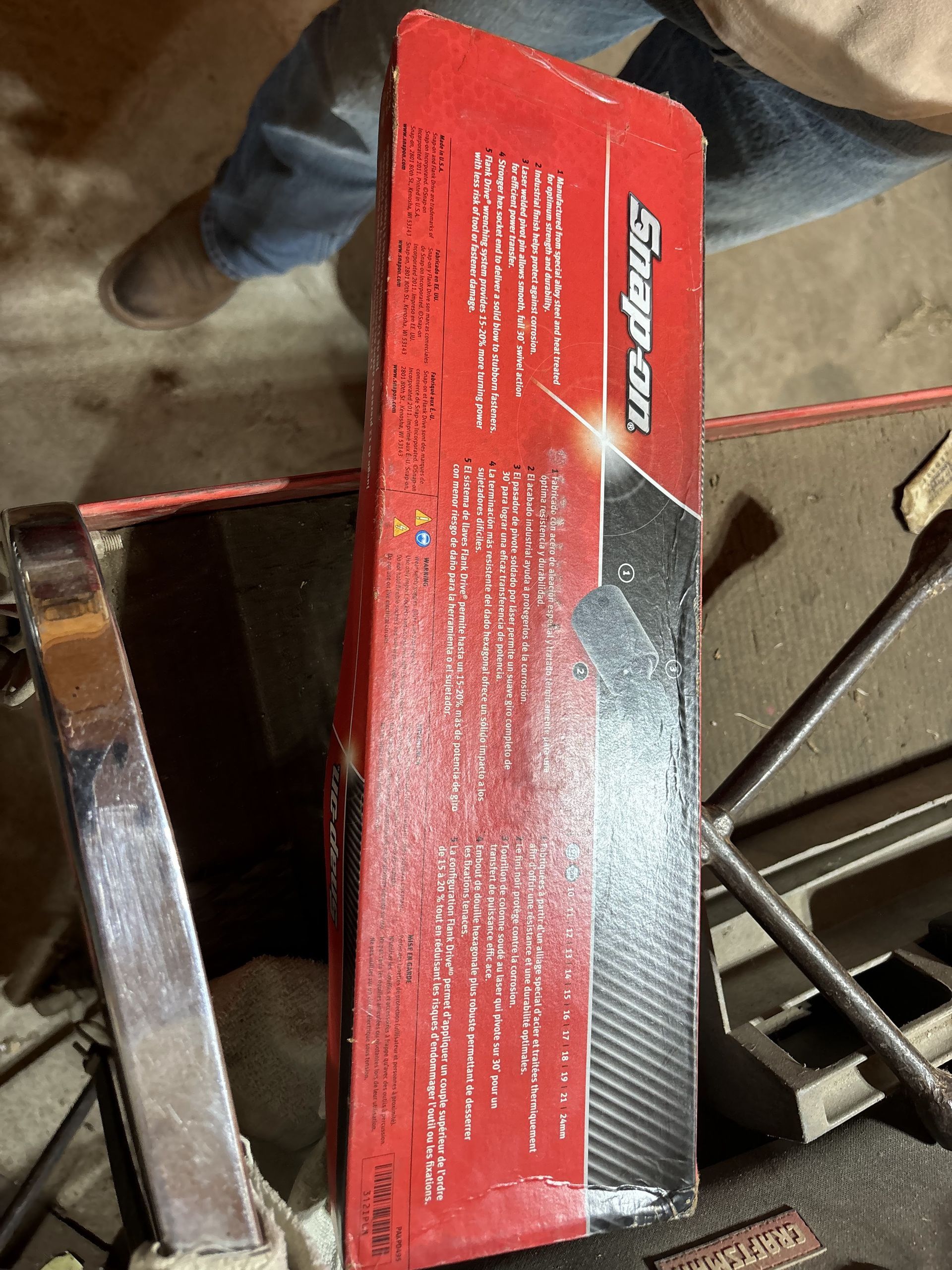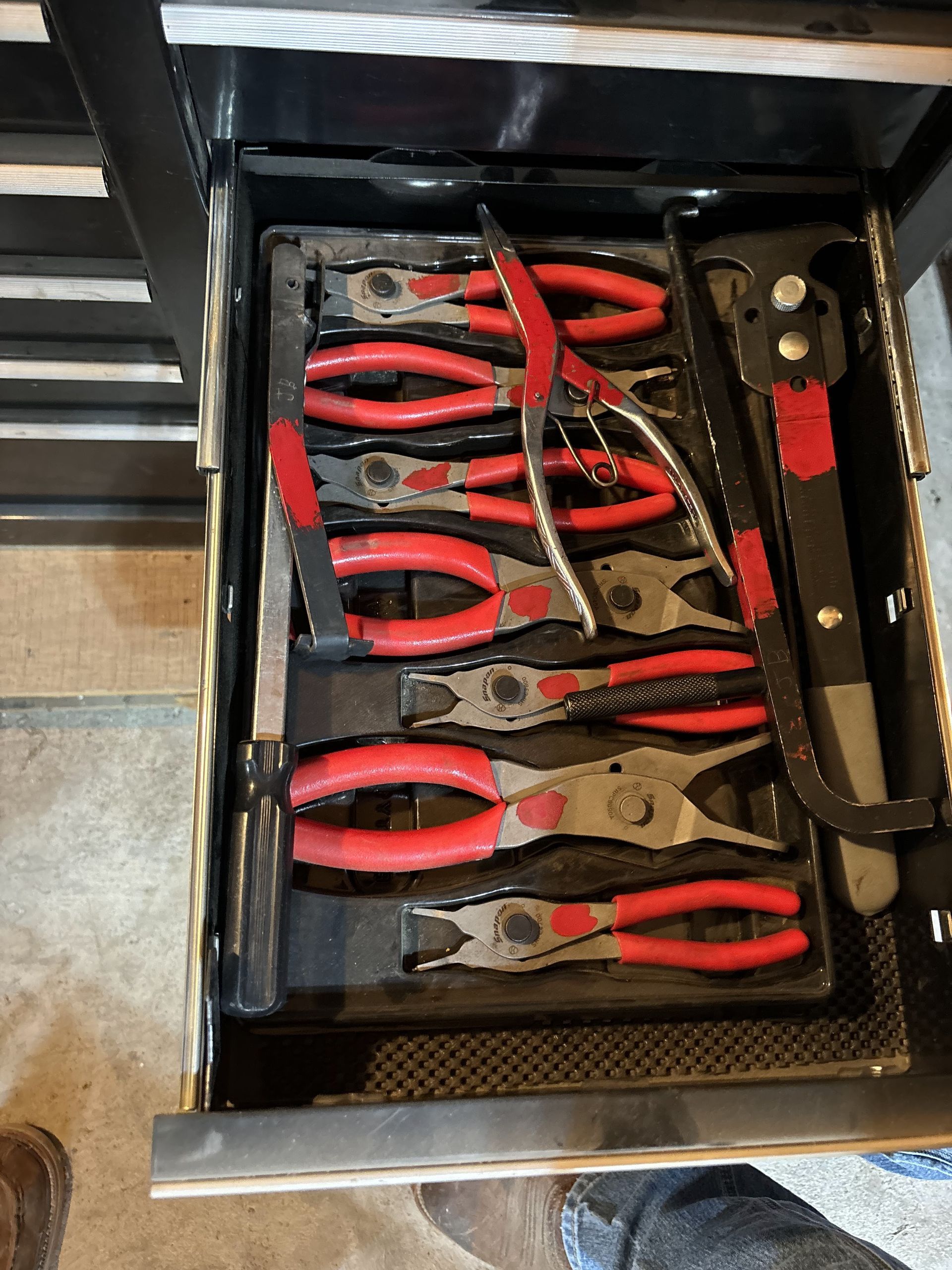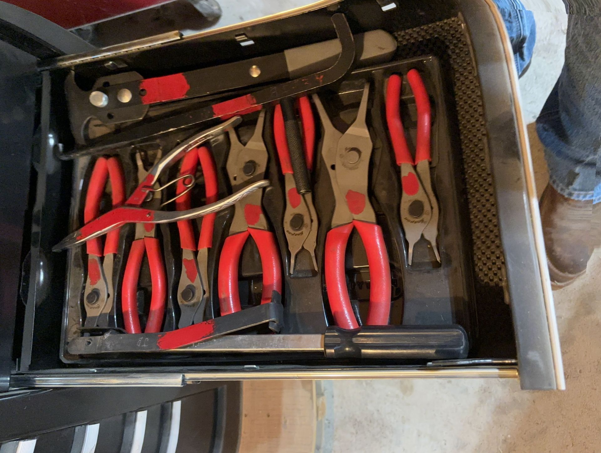 - Snap-On Tools: Rolling Tool Chest, ⅜, ½ Torque wrenches, Torx Drivers, ⅜ swivel, 10-16 Metric Wrenches, Bits, Snap ring pliers, Dead Blow, 25 pcs screw extractor, Metric Tap/Die Set SAE, Allen Wrenches, ⅜” ½” Impacts, 48pc SAE/Metric Rethreading Set, Electric Screwdriver, Work Light, Pry Bars