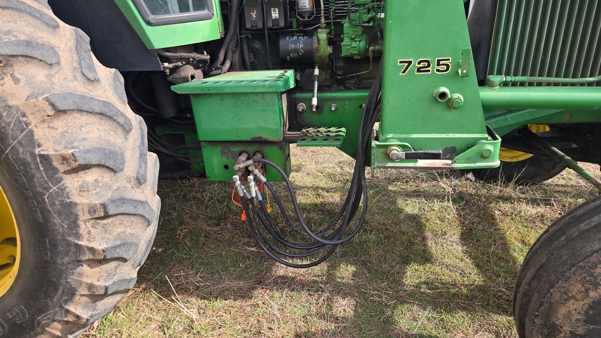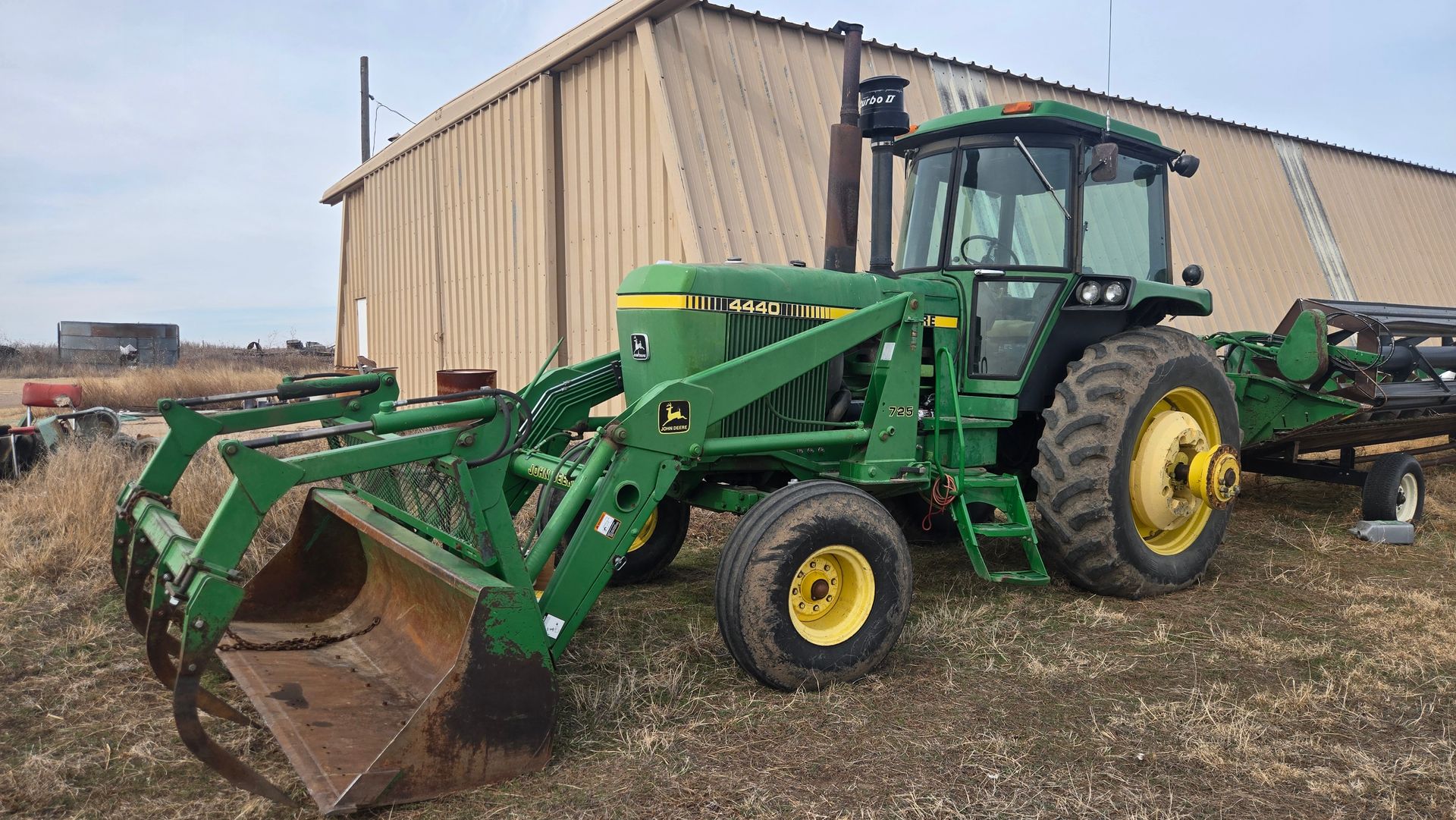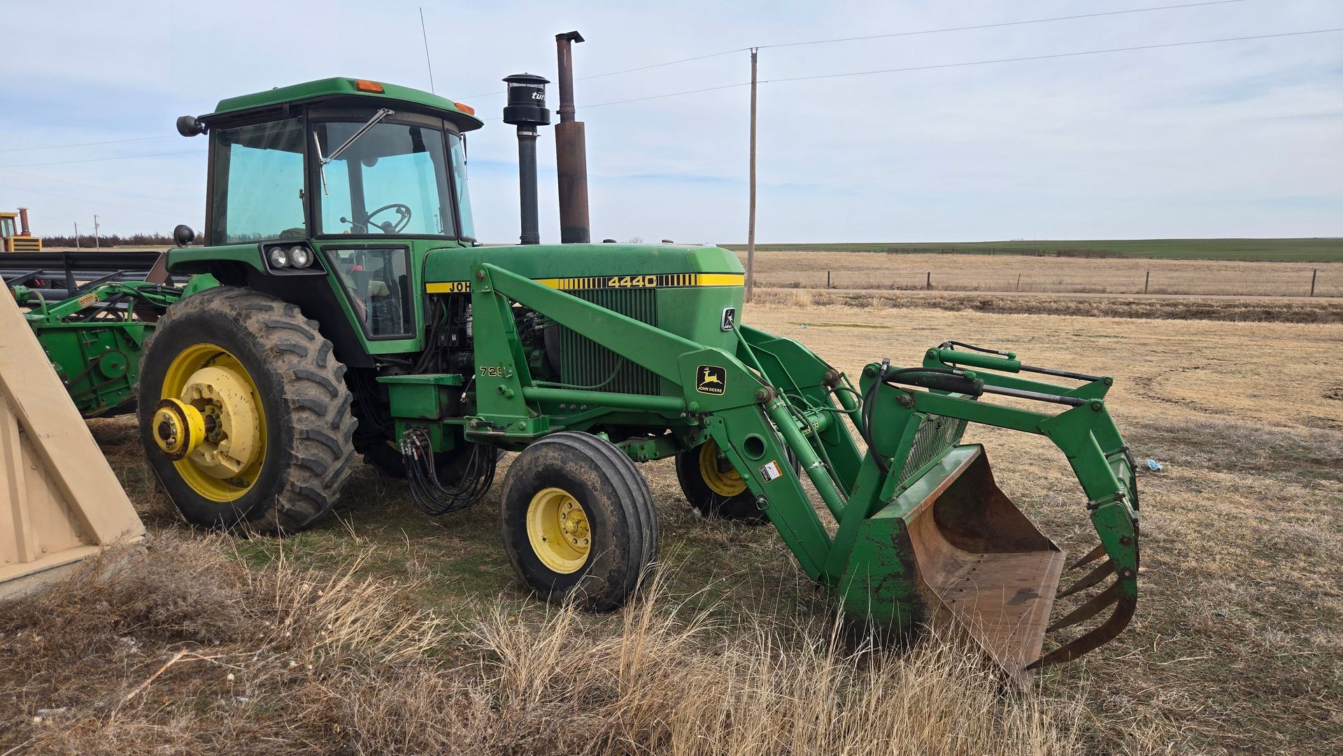 - John Deere 4440 Duals; 725 Loader and Grapple; Joystick; Quad Shift; 2 Remotes; 3 pt; 10,657 hours; SN:065897RW
