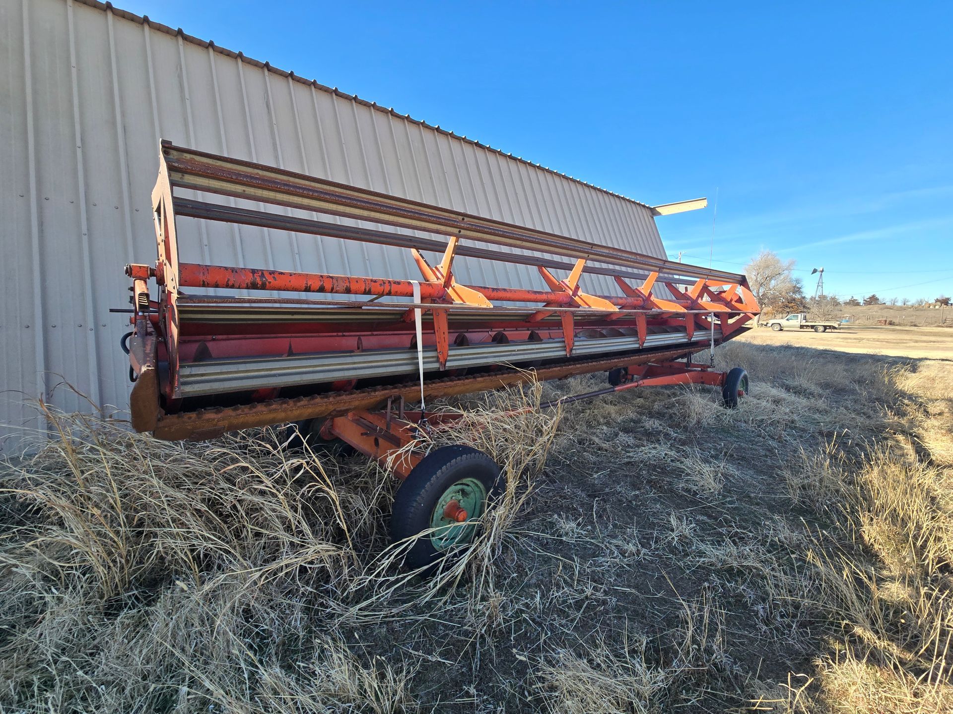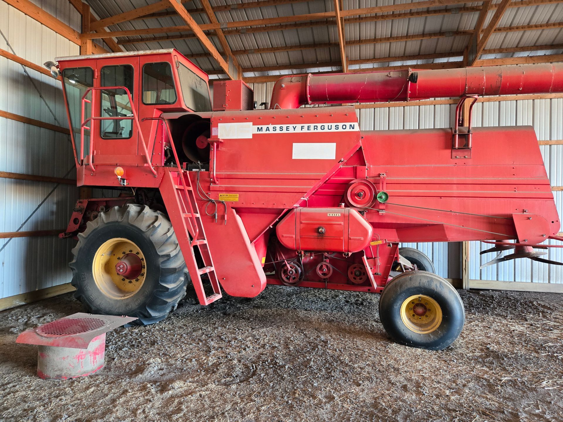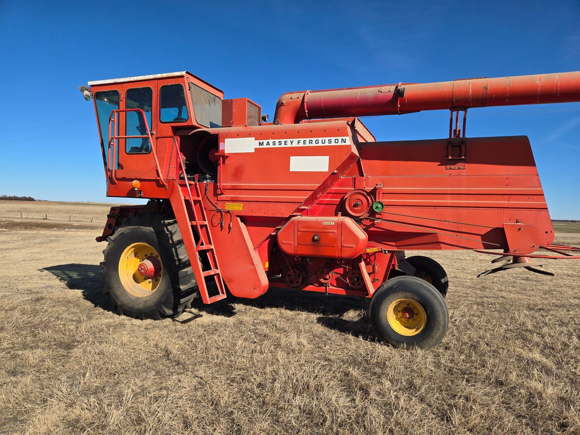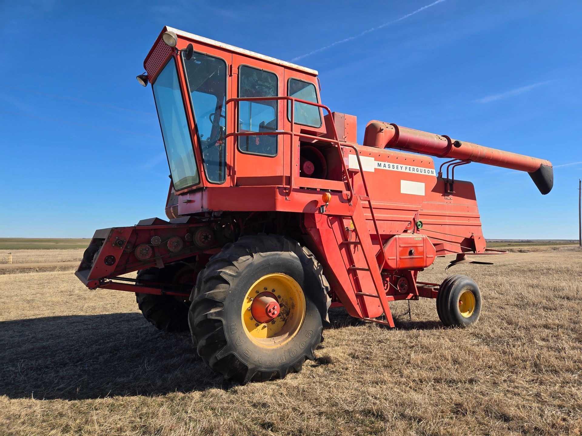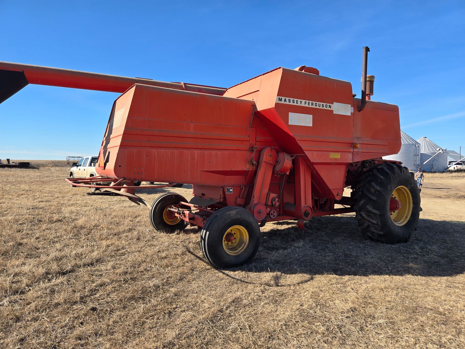 - Massey Ferguson 750 Combine; 23.1-30 Tires (good rubber); Hydro Perkins; 1762 Hours; good condition & has been shedded; SN:1696-14358, 24’ Header w/ Trailer