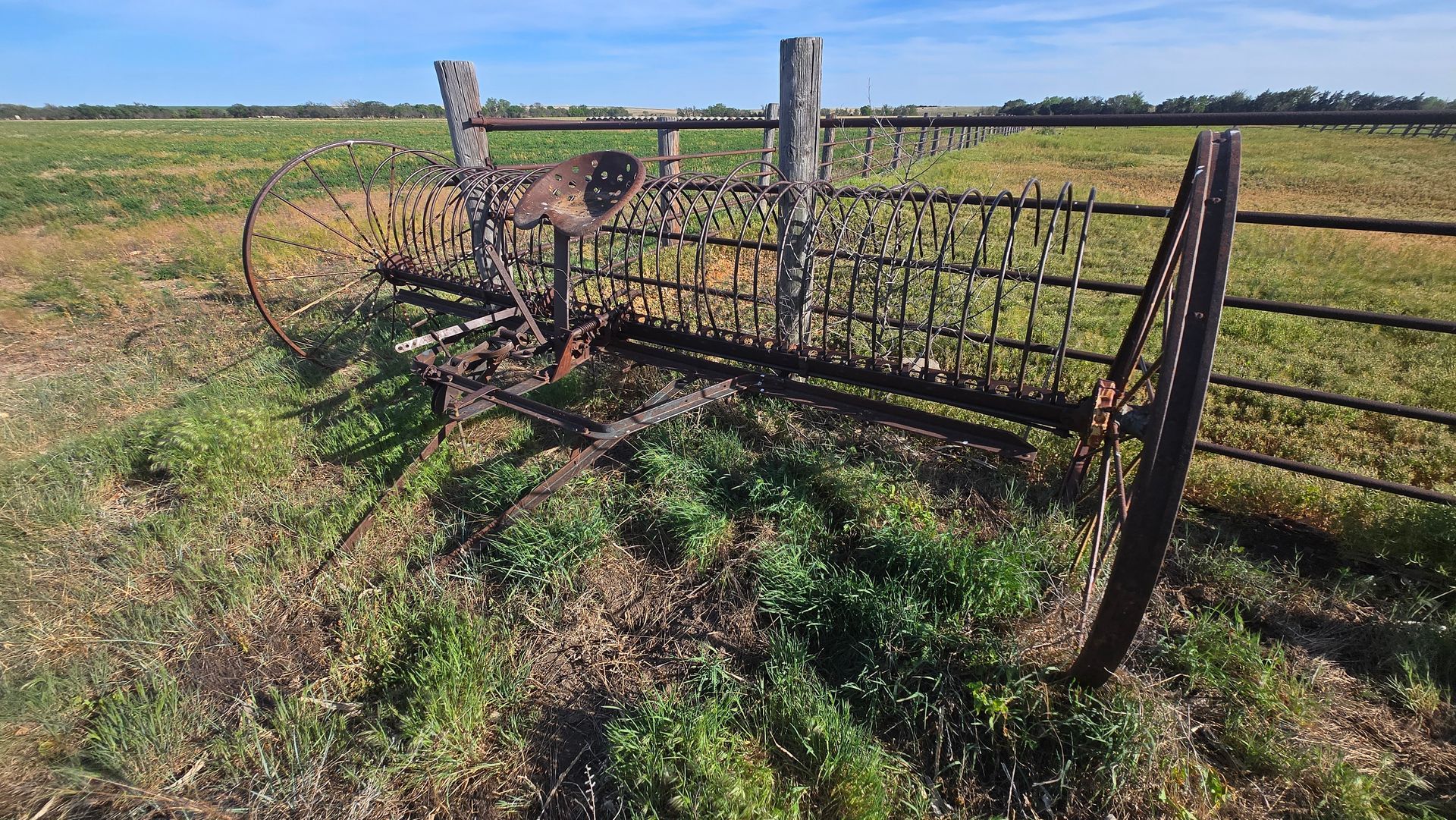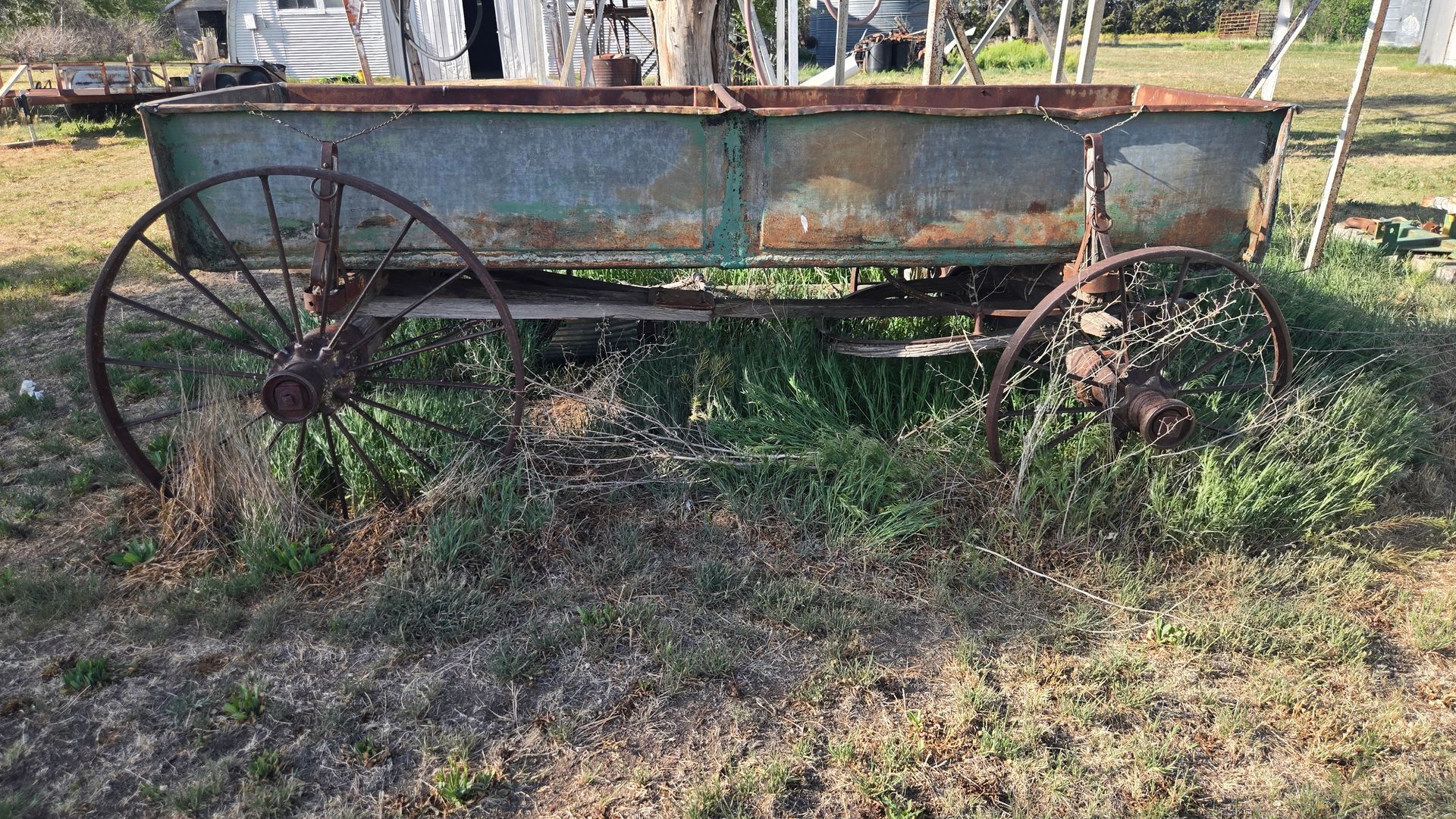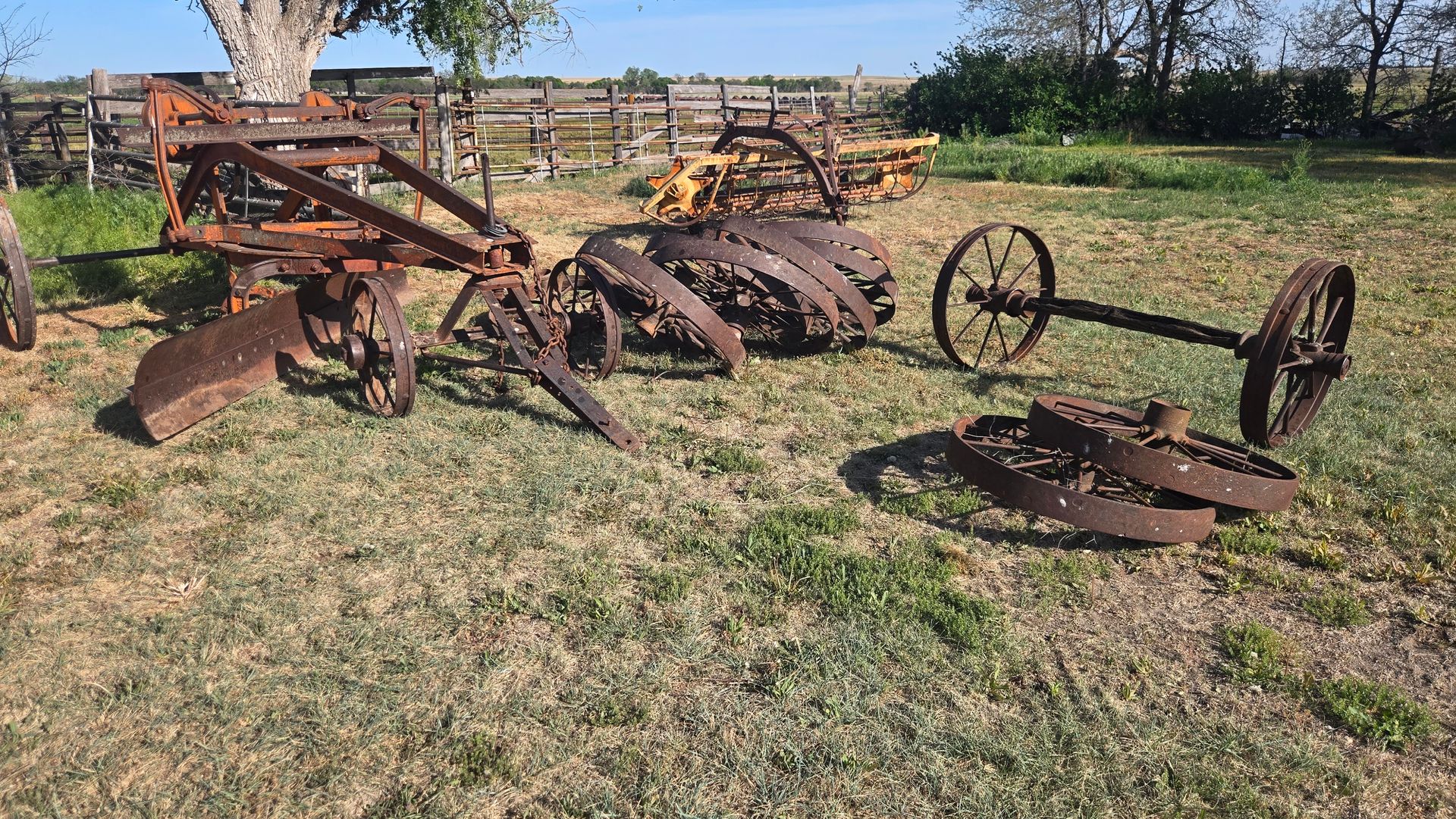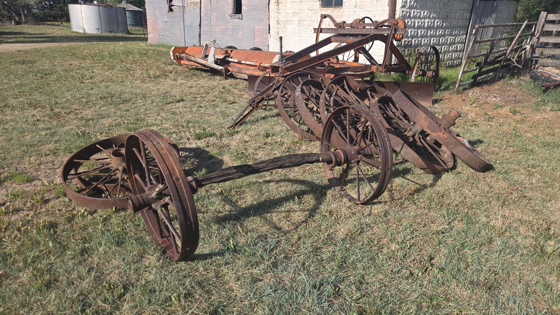 - Old grain wagon on steel, Dump rake, Disc harrow