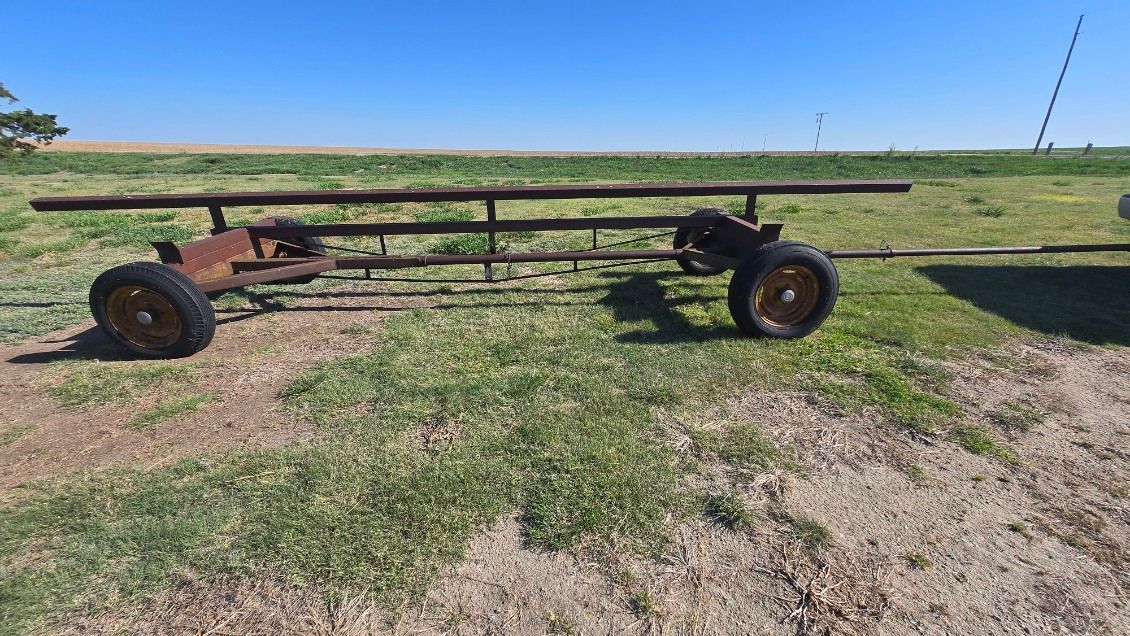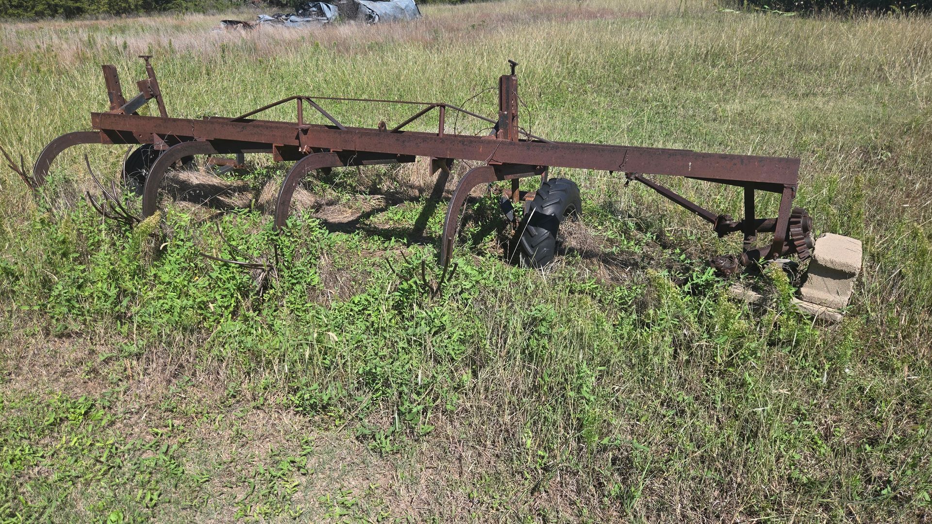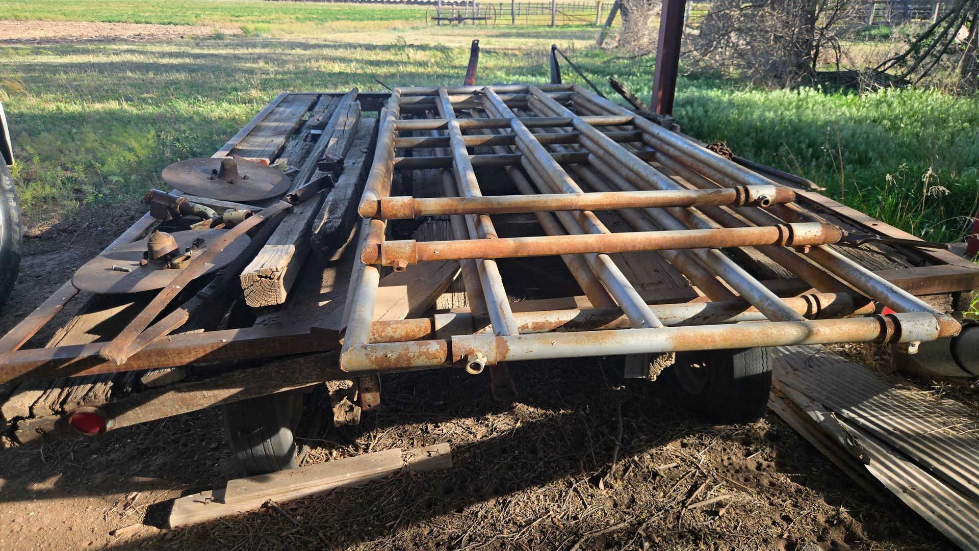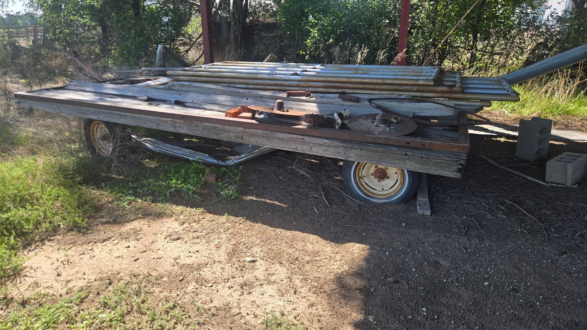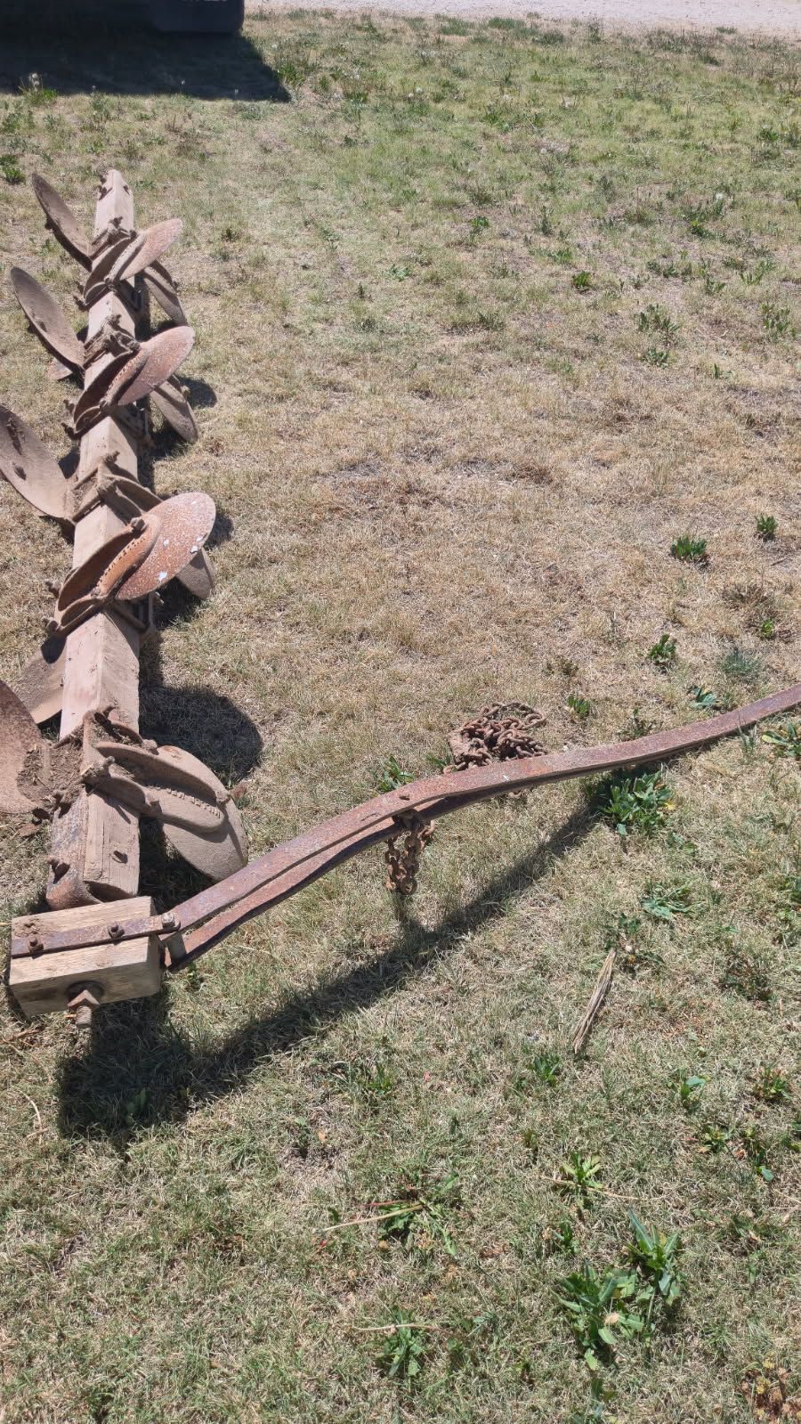 - Old grain wagon on steel, Dump rake, Disc harrow