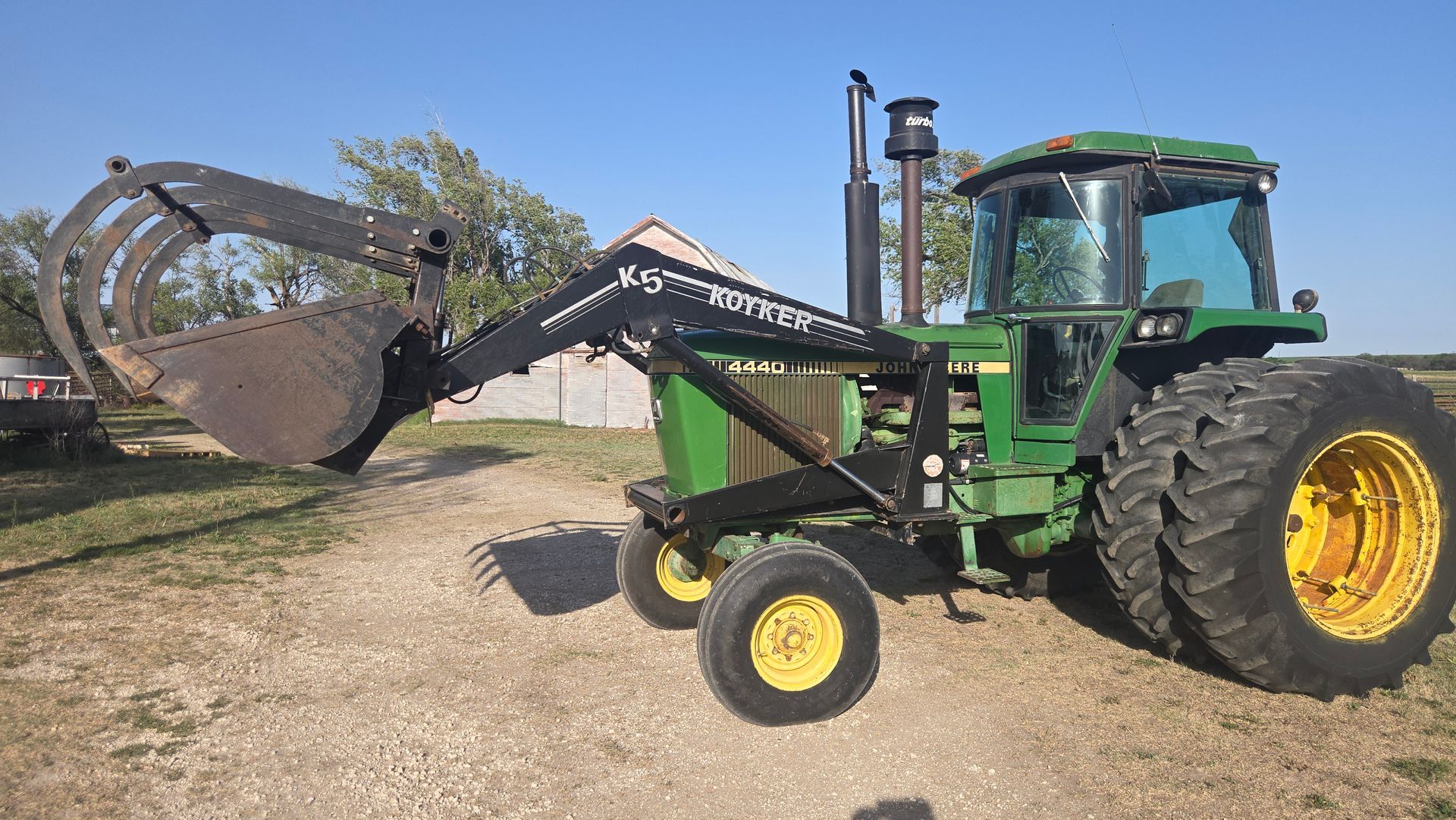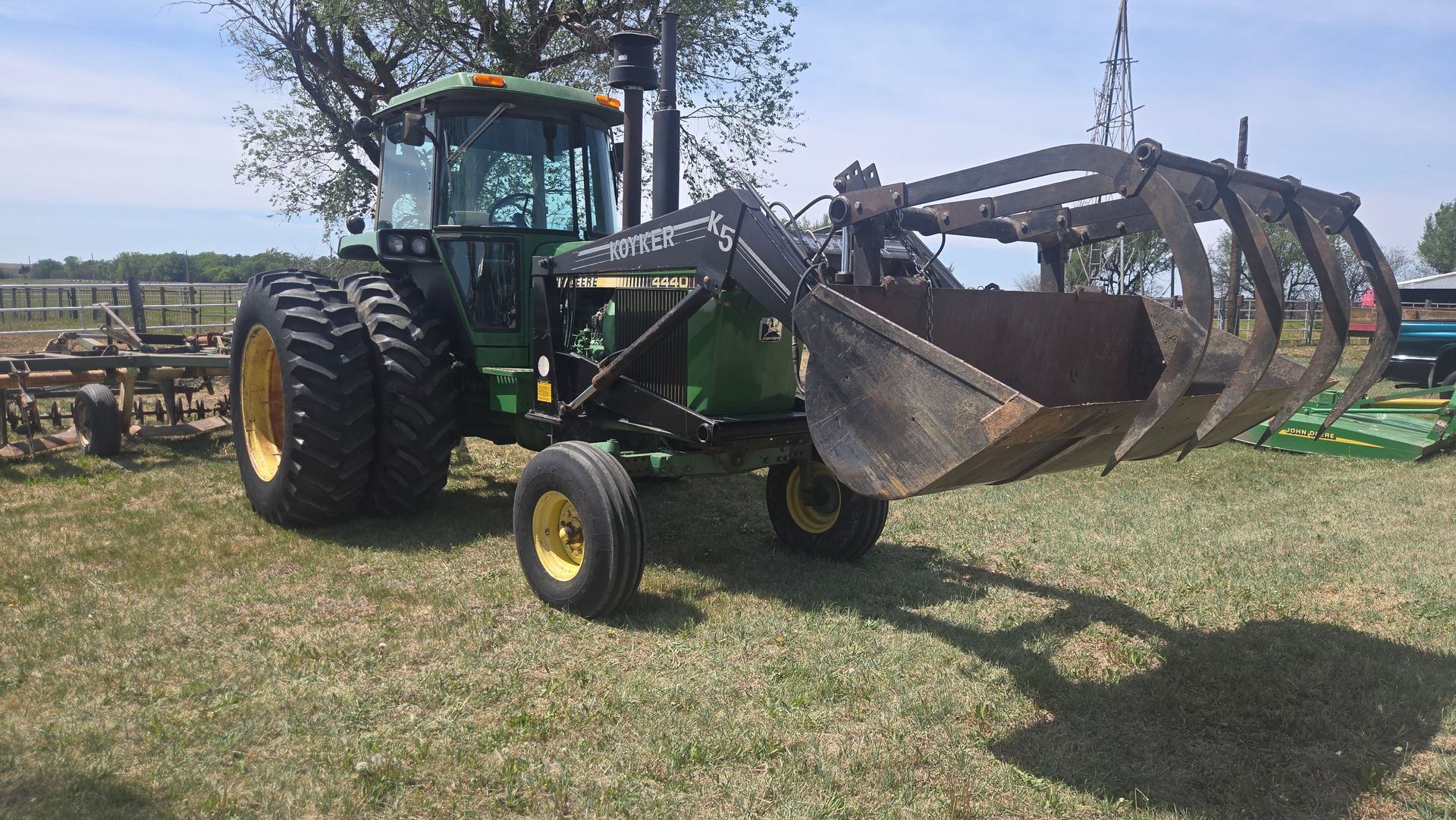 - JD 4440 w/K5 Koyker loader/grapple, quad range, 3 hyd., bareback, 8950 hrs., 18.4x38 rear duals, 10:00x16 front, $9000 recent repairs including splitting for repairing perma clutch & 2spd., rear main seal and more, SN:4440H049671R