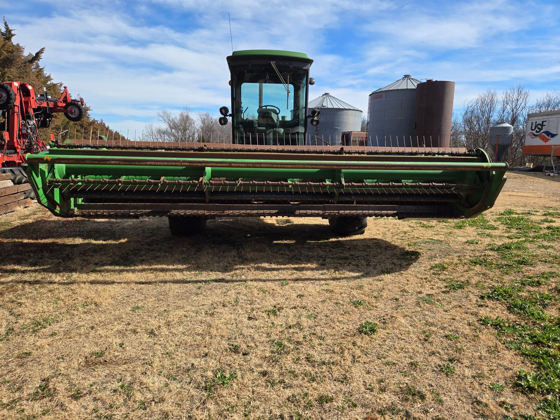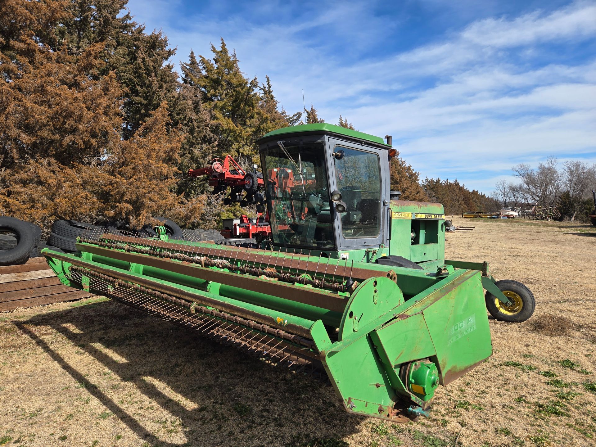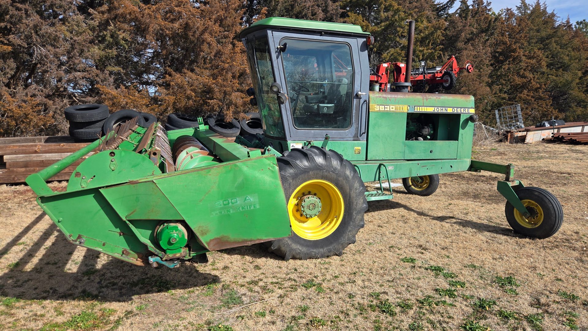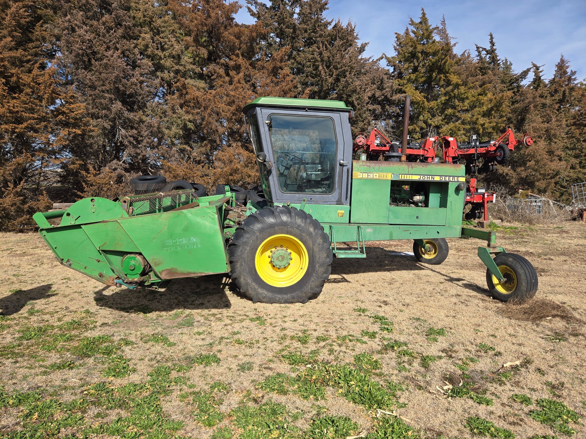 - JD 3830 Swather, hydrostat w/4-cylinder diesel, shows 4645 hrs., 16' header, 300-A twin knife SE# EO3830X810053