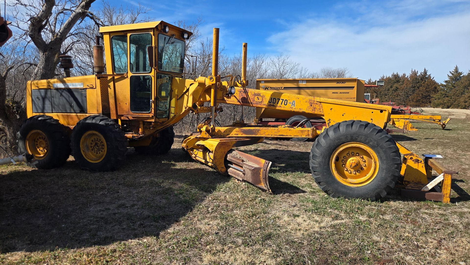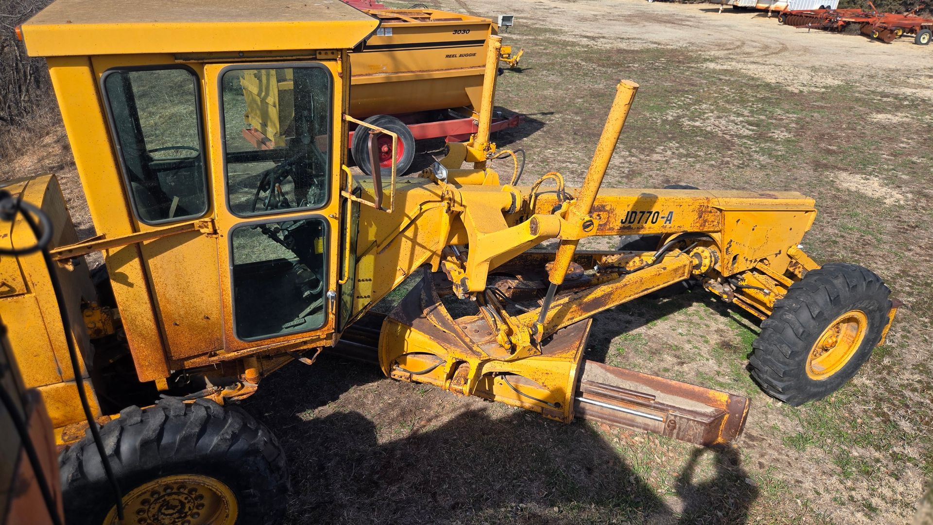 - JD 770-A Motor Grader w/ 531 engine, shows 4367 hrs., gear drive w/ hydraulic controls, 14' new cutting edge, SE#06916T