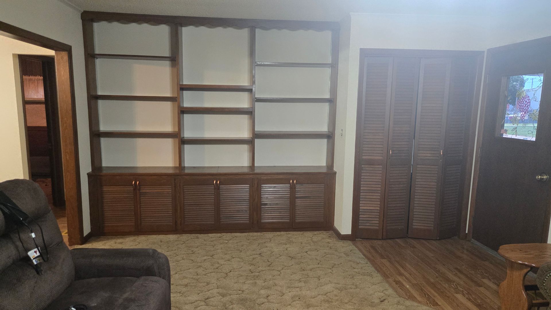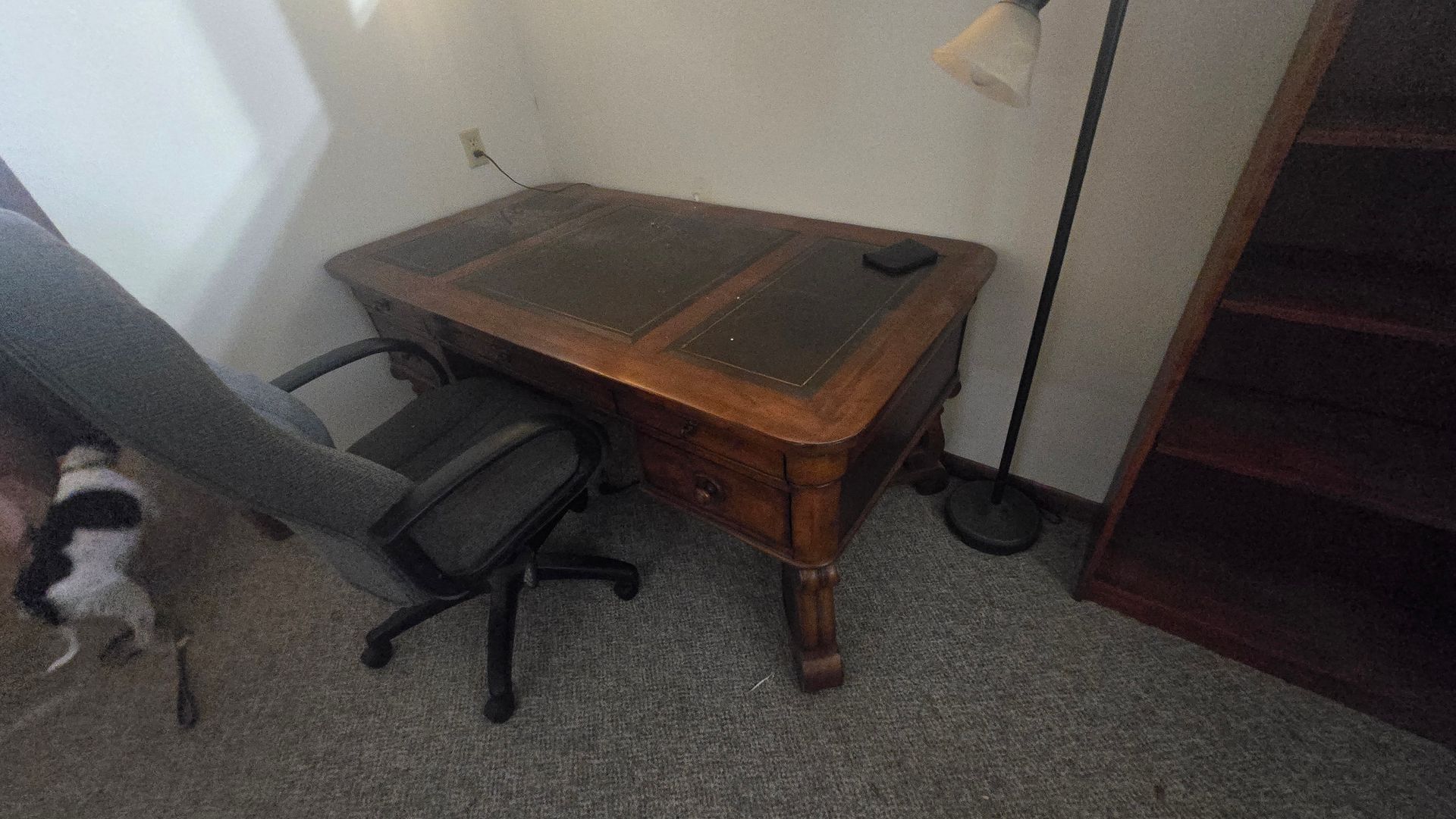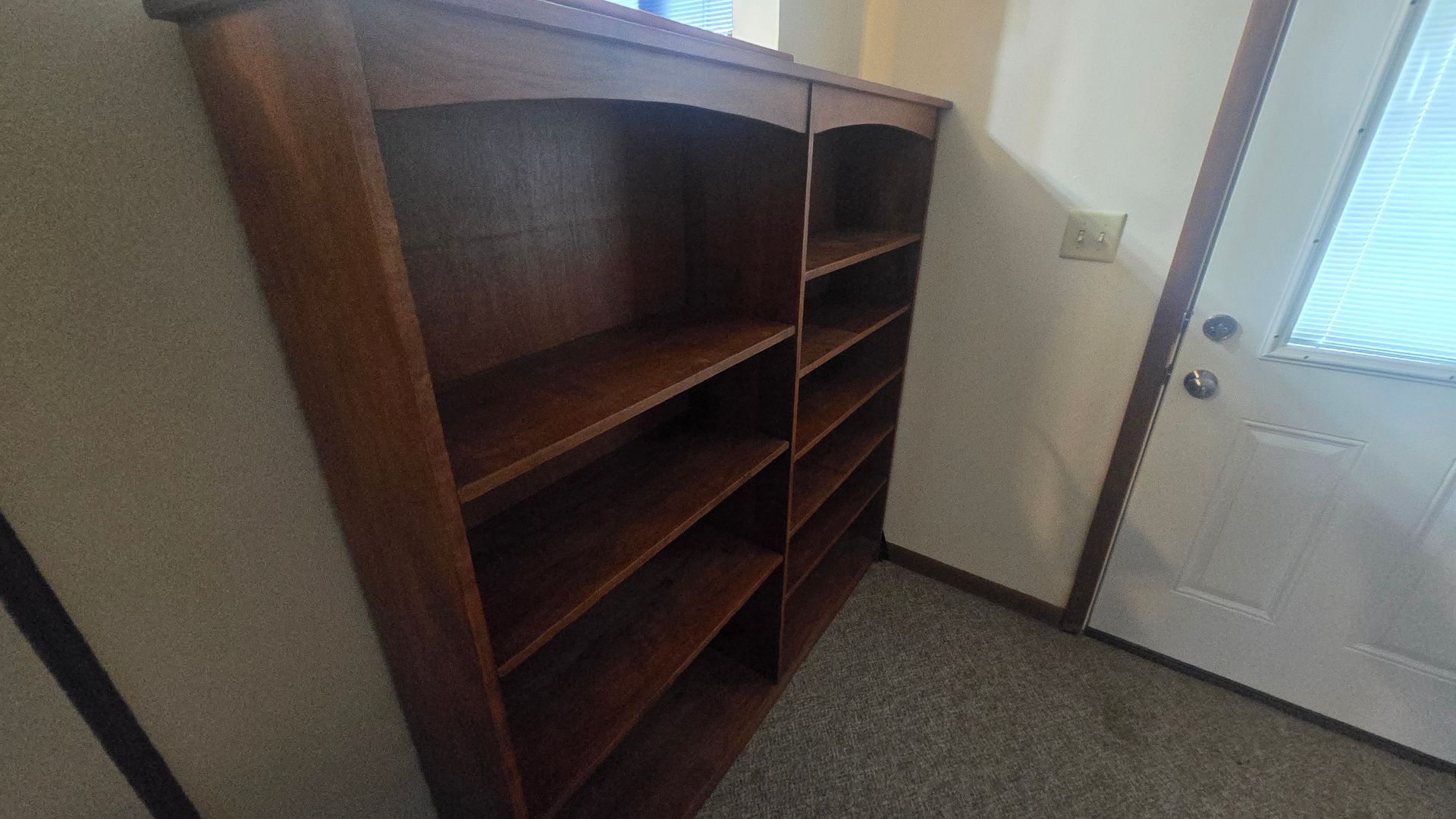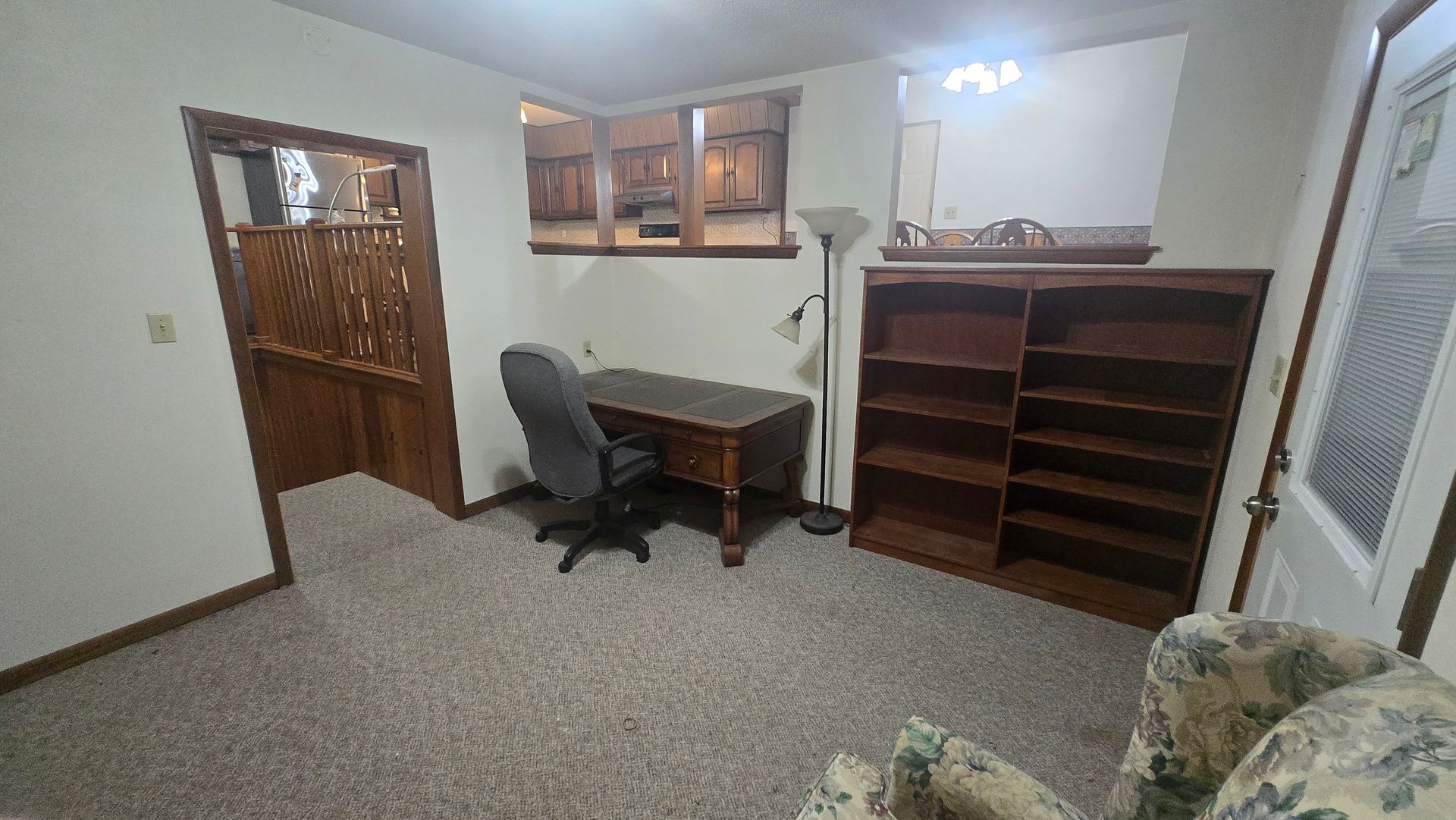 - Book shelves, wooden desk
