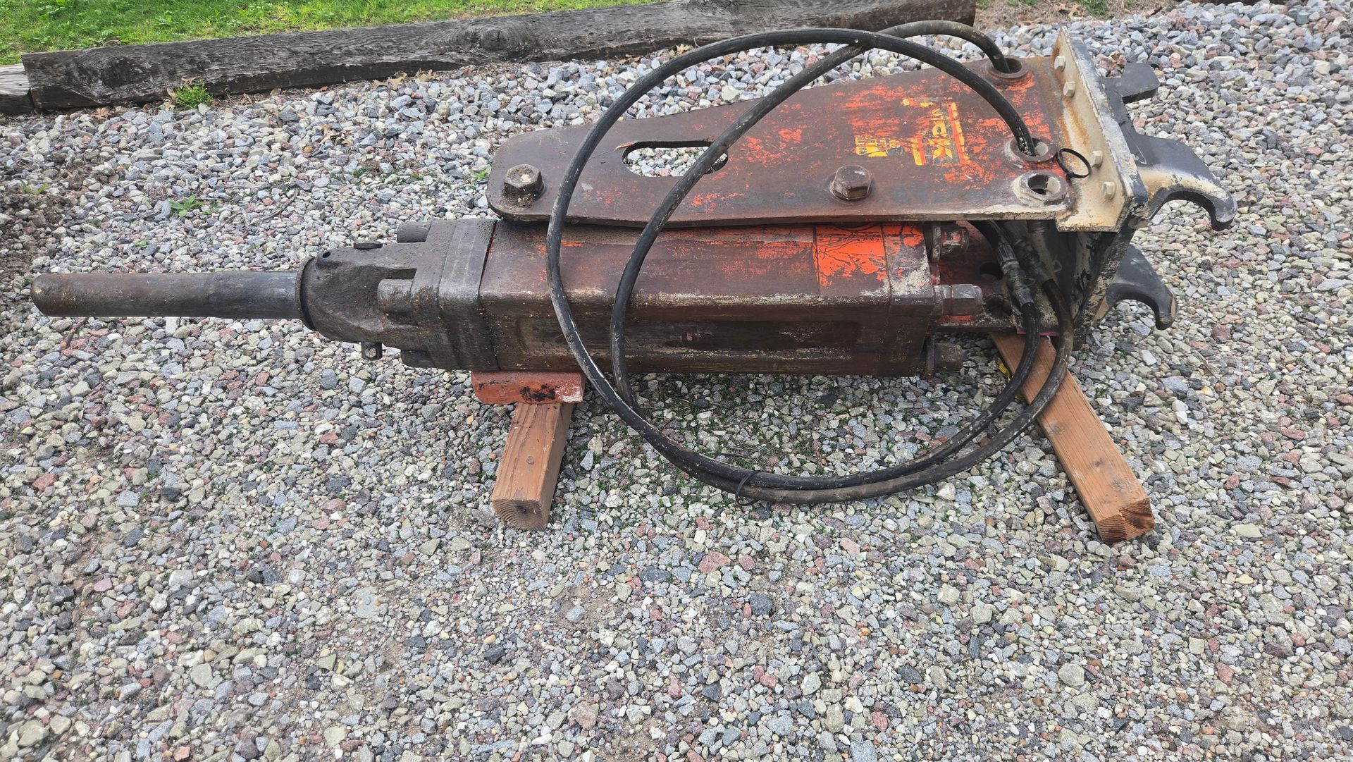 - NPK hyd. hammer w/JD quick attach, original, off Cat 423 backhoe